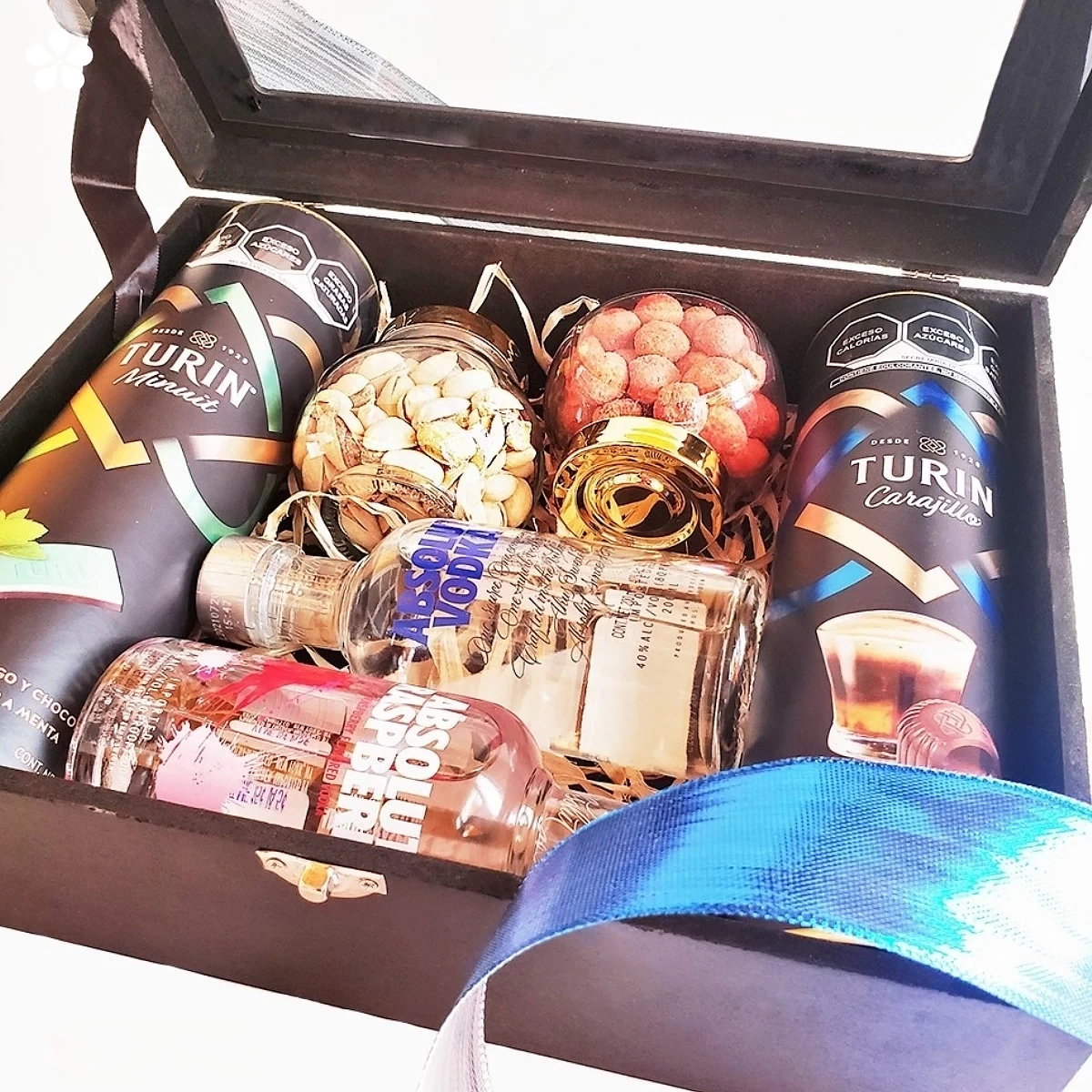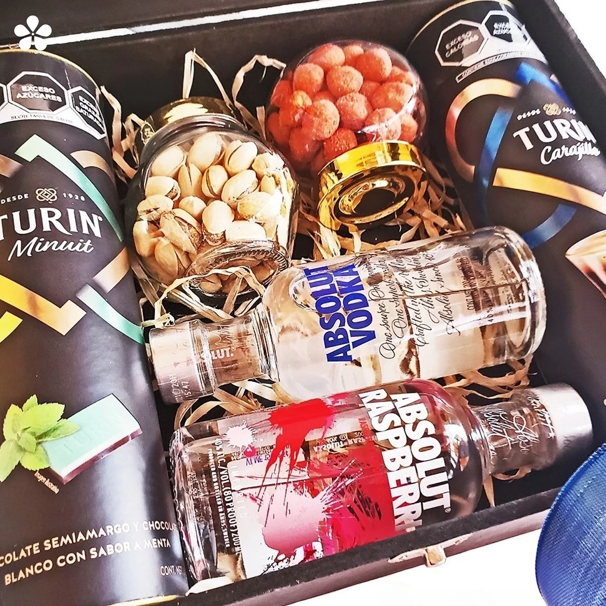 Estuche gourmet con Absolut, chocolates Turín y botanas selectas. Fusión premium de sabores en presentación moderna. Medidas: 30 × 25 × 10 cm.