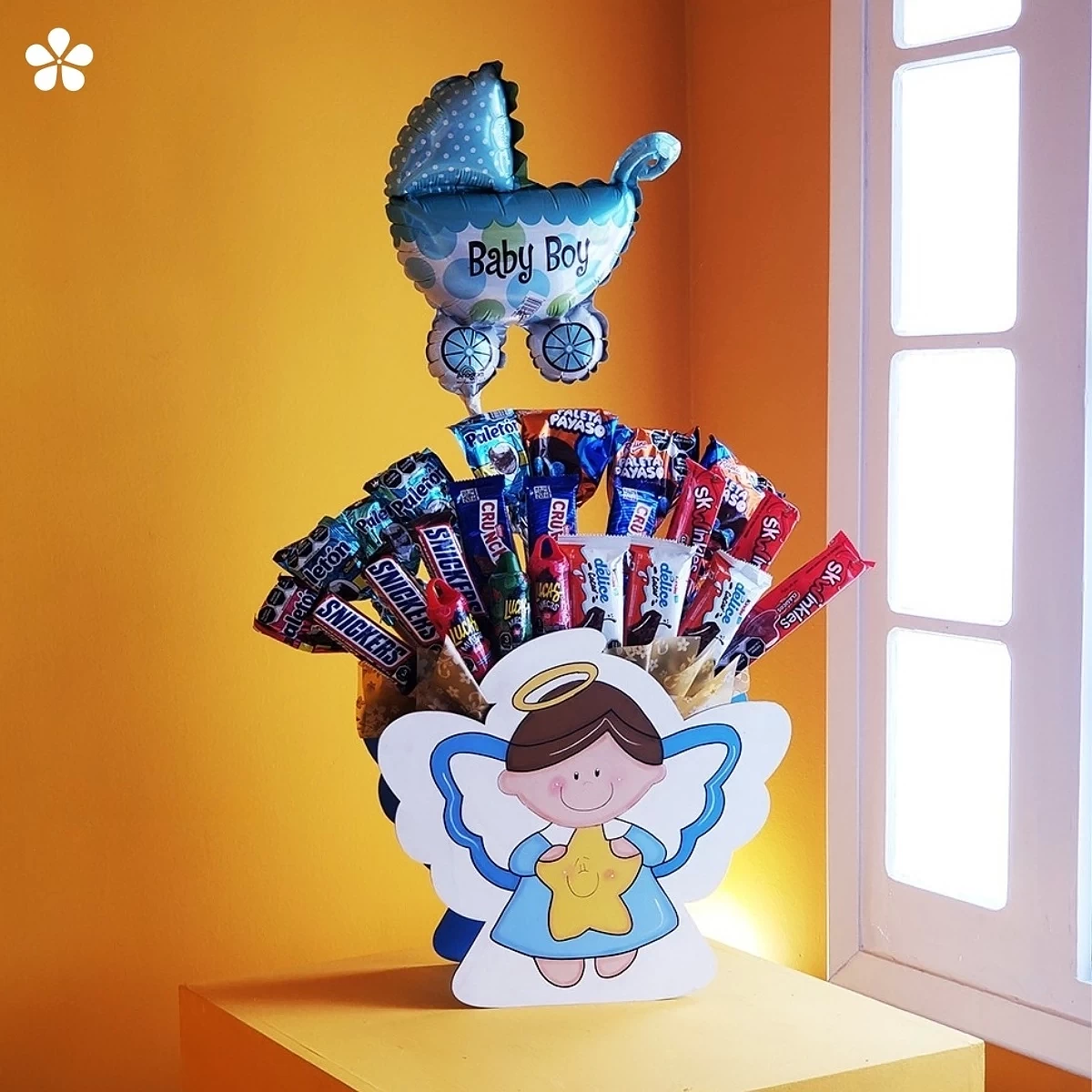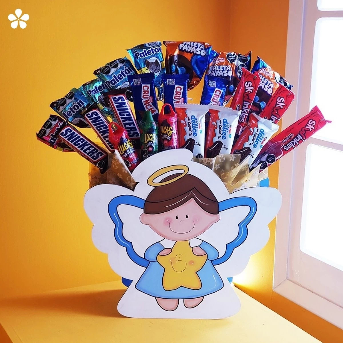 Ángel Dulce – base azul con surtido de dulces