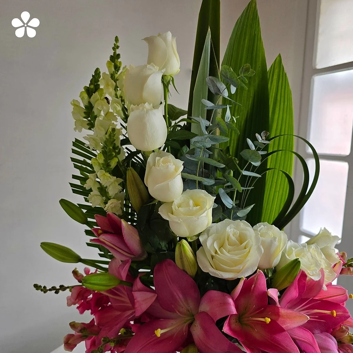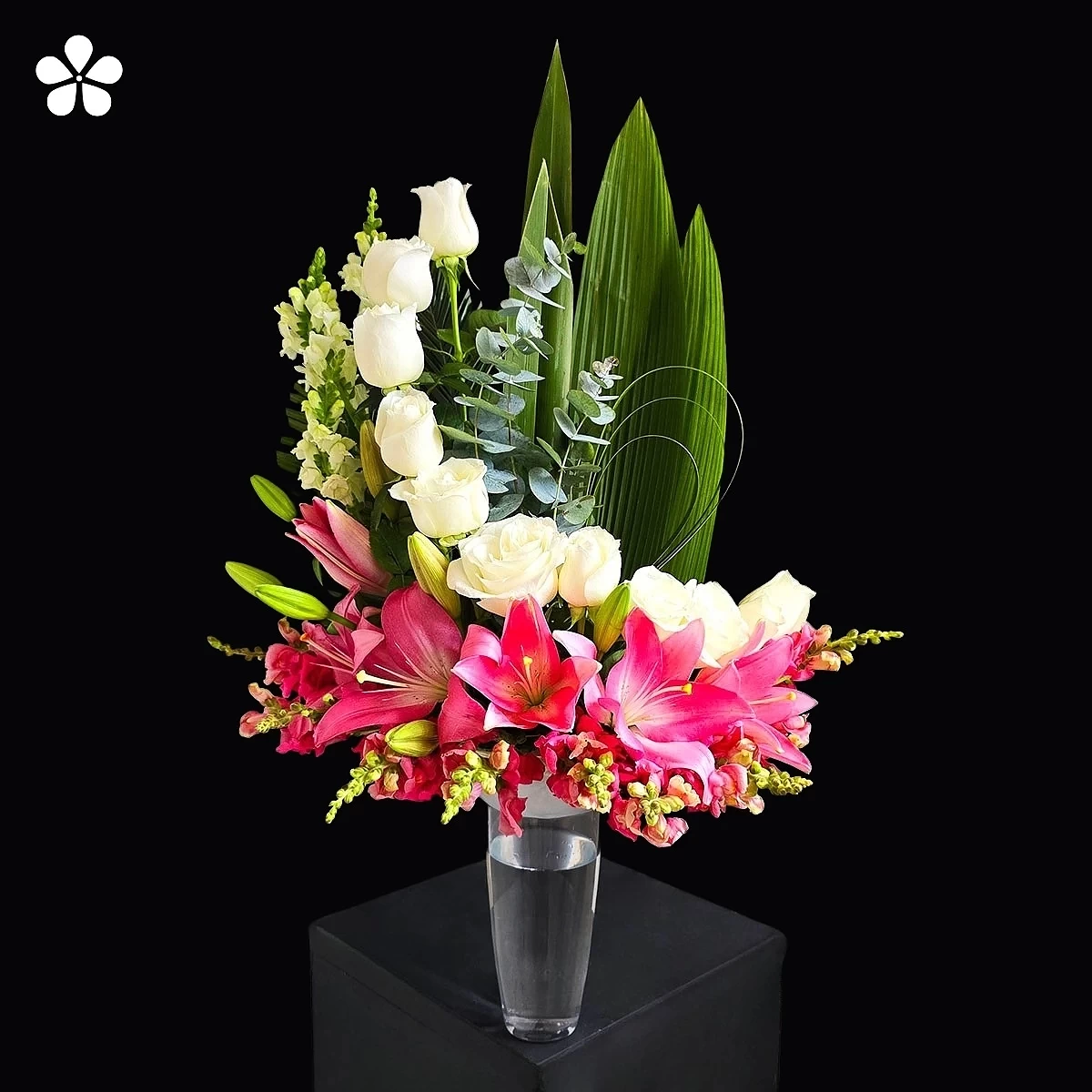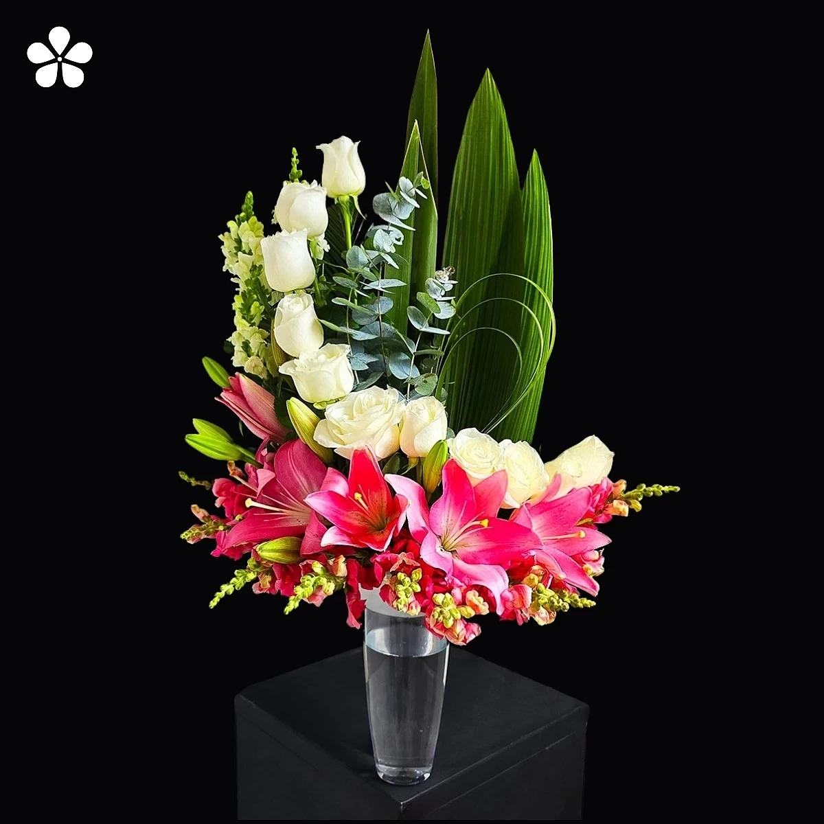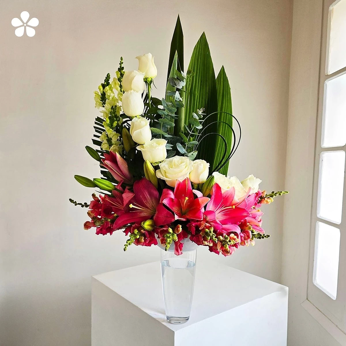 Arreglo contemporáneo que combina la serenidad de las rosas blancas con la energía vibrante de las lilis rosadas, enmarcadas con follaje tropical y eucalipto. El florero transparente resalta la frescura de cada flor creando equilibrio y estilo refinado.