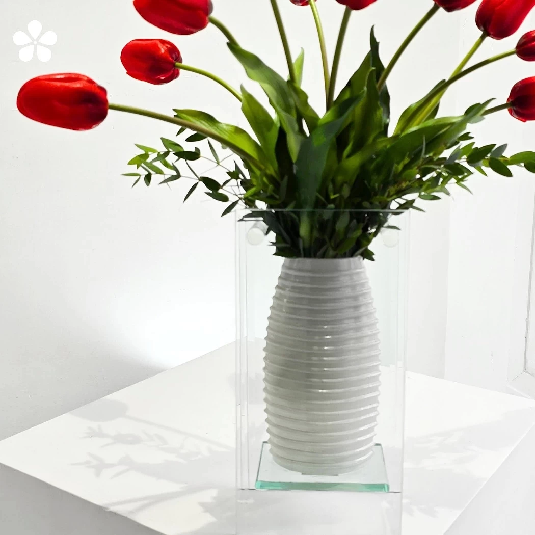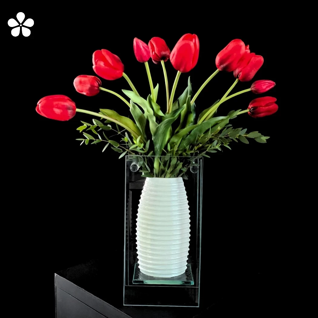 Los tulipanes rojos, intensos y perfectamente curvados, se elevan con natural gracia desde un florero blanco texturizado, enmarcado por una estructura de vidrio que aporta profundidad y sofisticación.