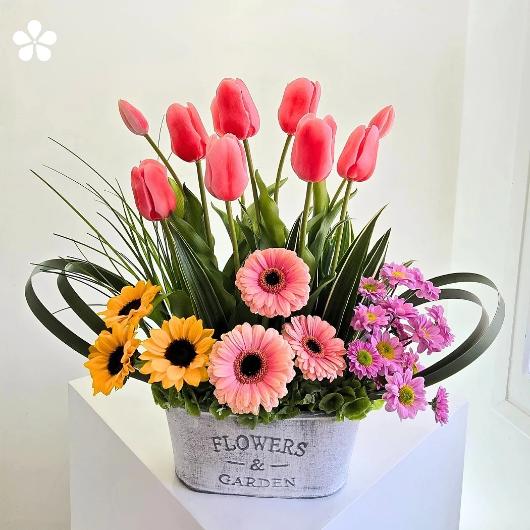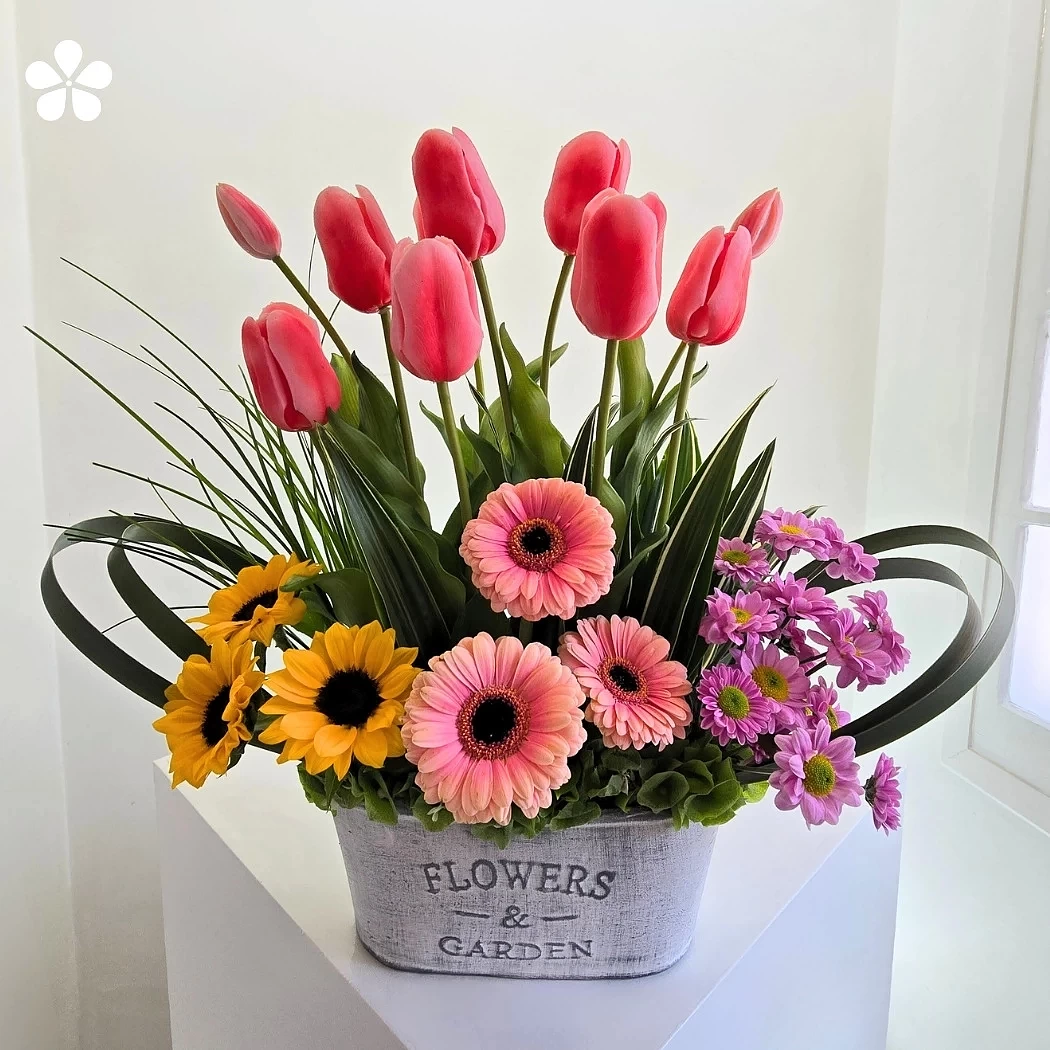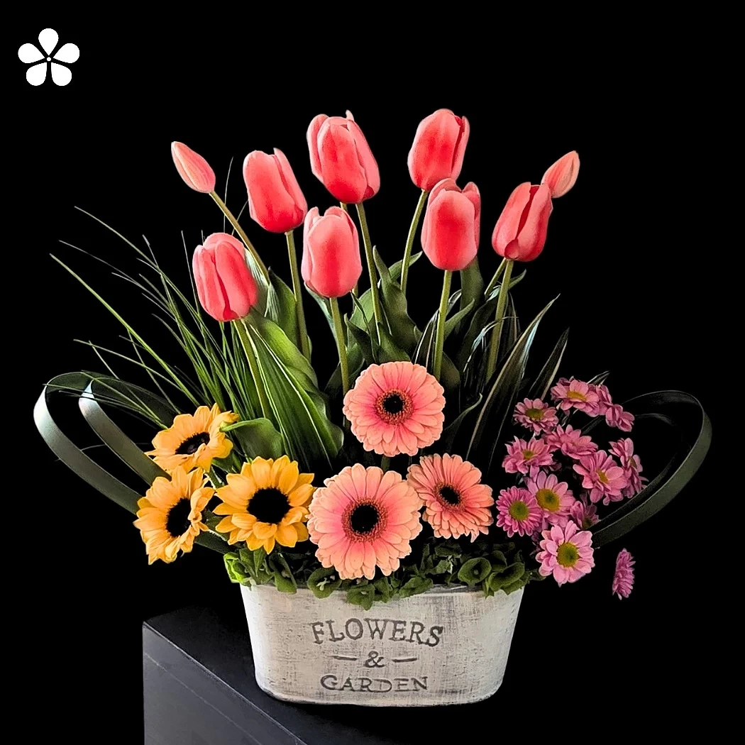 En la base, una alegre combinación de gerberas rosadas, girasoles y margaritas lilas crea una transición armónica entre matices cálidos y fríos. Todas las flores reposan sobre un contenedor rústico con la leyenda “Flowers & Garden”, que realza la esencia natural y campestre del diseño.