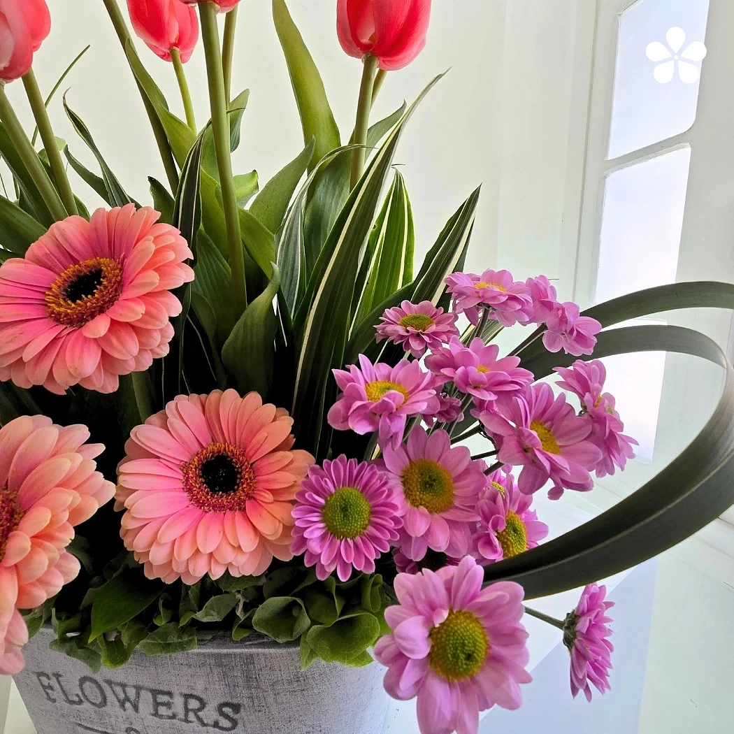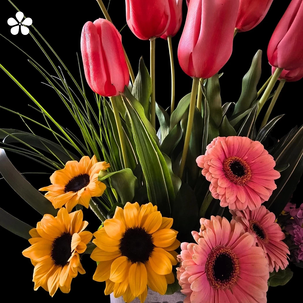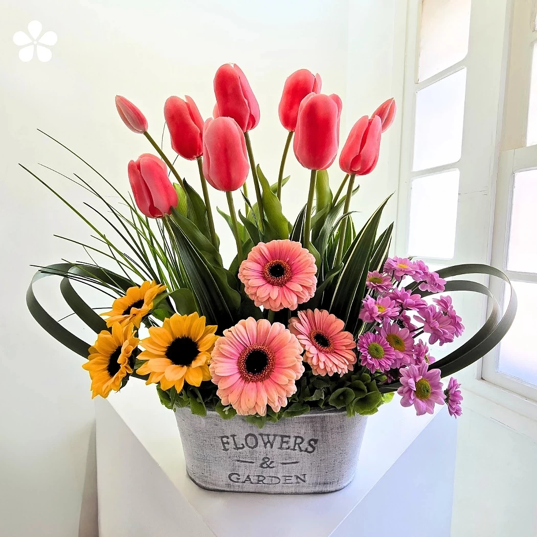 En la base, una alegre combinación de gerberas rosadas, girasoles y margaritas lilas crea una transición armónica entre matices cálidos y fríos. Todas las flores reposan sobre un contenedor rústico con la leyenda “Flowers & Garden”, que realza la esencia natural y campestre del diseño.