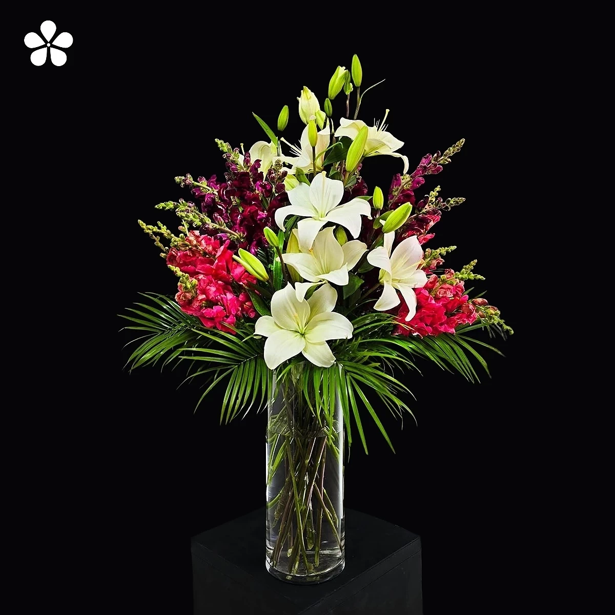 Arreglo floral que evoca la serenidad de paisajes naturales con diseño vertical y estilizado perfecto para ambientes que buscan distinción. Presentado en florero cilíndrico de cristal que permite admirar la belleza desde todos los ángulos.