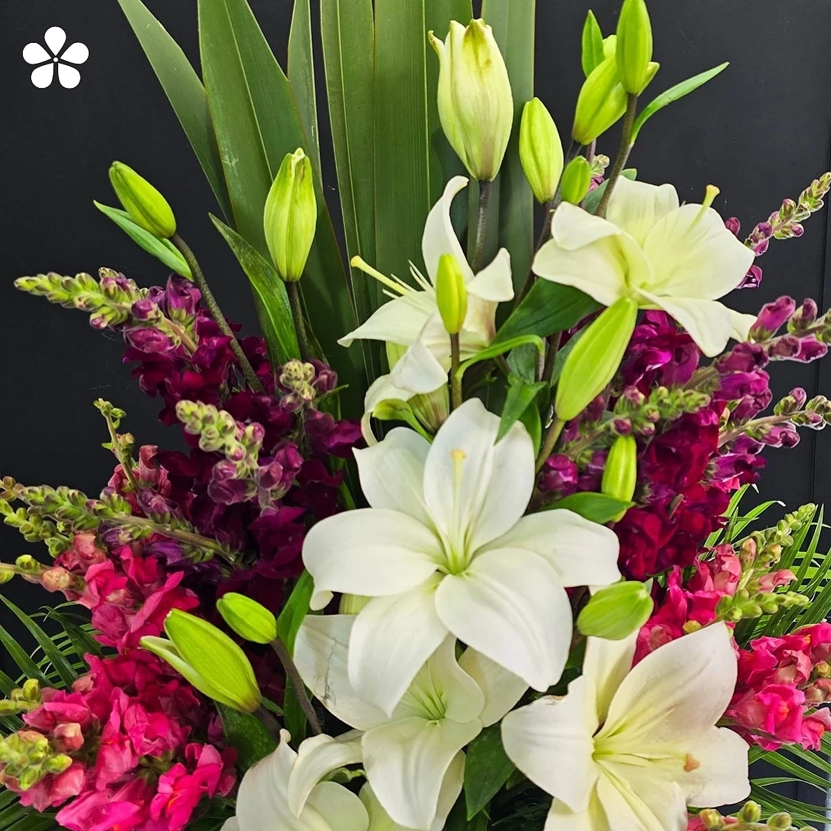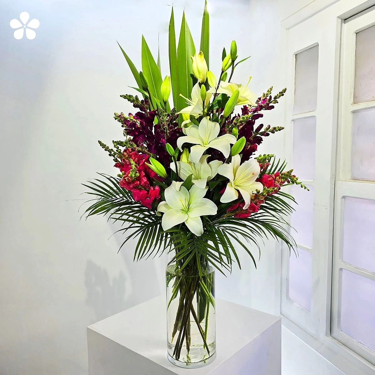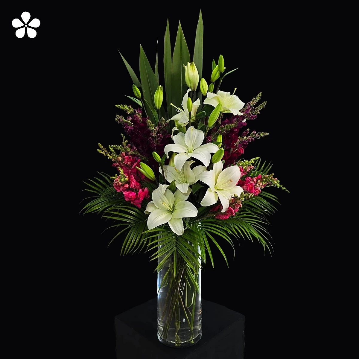 Lilis blancas en florero cilíndrico de 1 metro. Elegancia tropical y frescura natural.