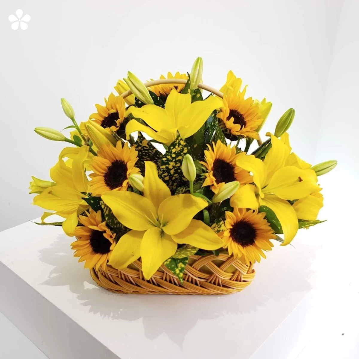 Girasoles y lilis en canasta de mimbre. Un detalle artesanal luminoso y alegre para cualquier espacio.