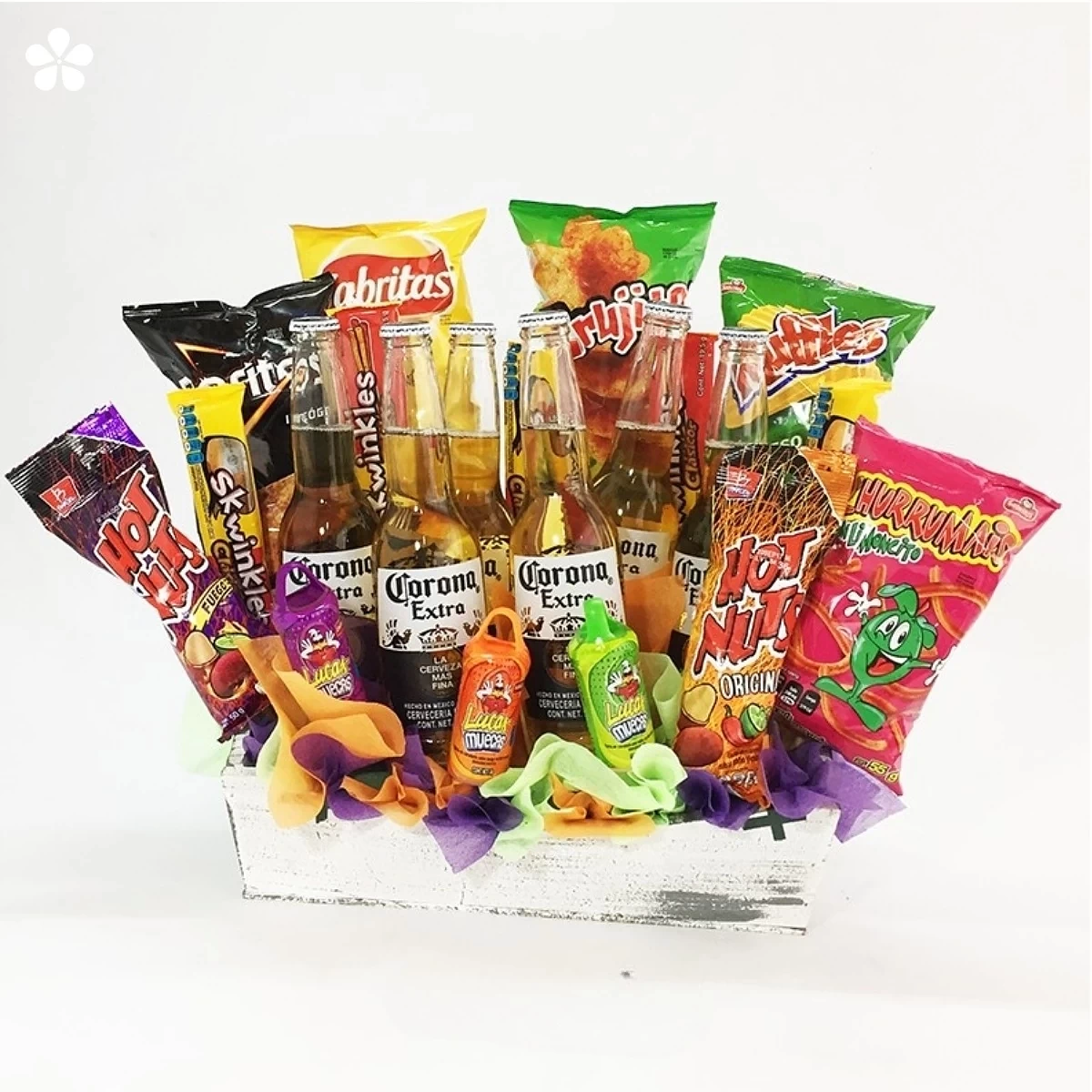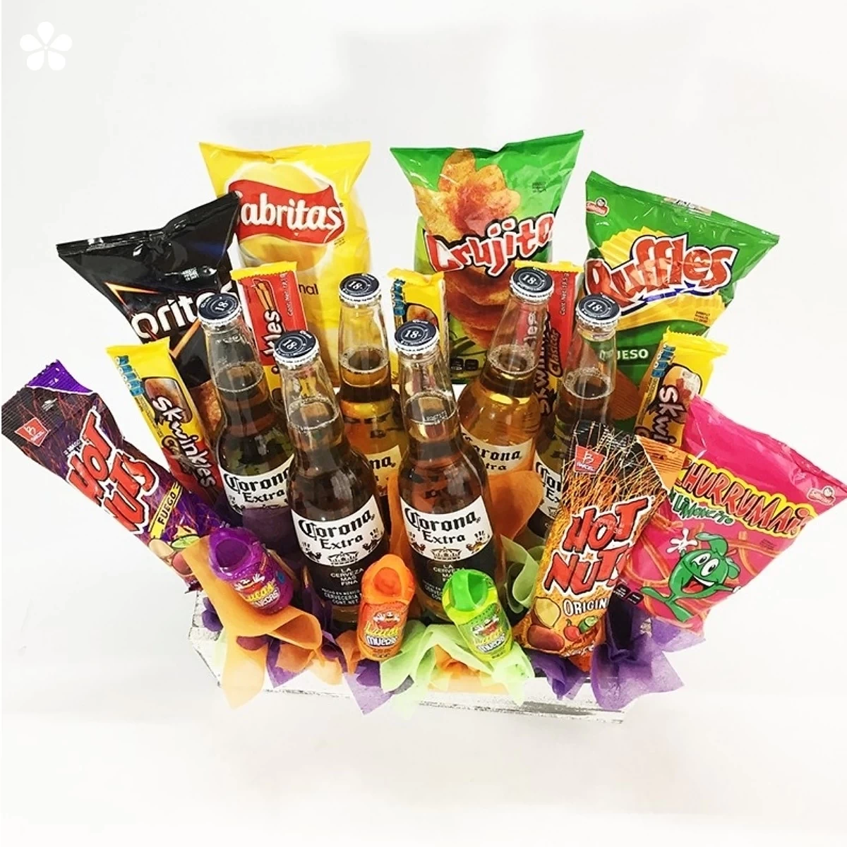 Canasta de cervezas y botanas. Ideal para reuniones entre amigos.