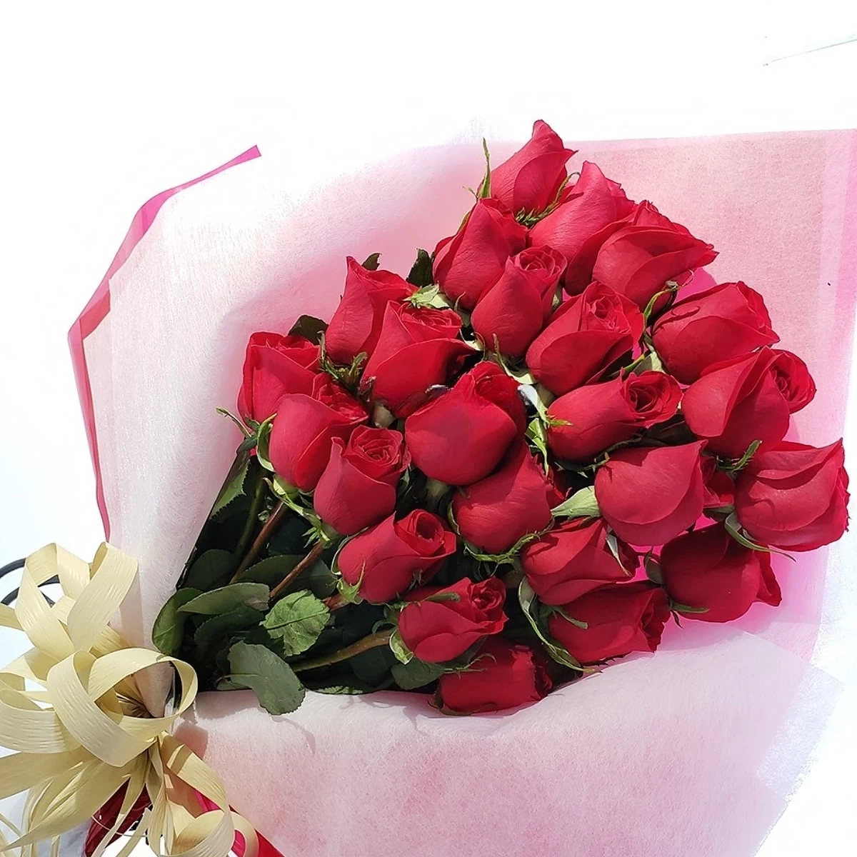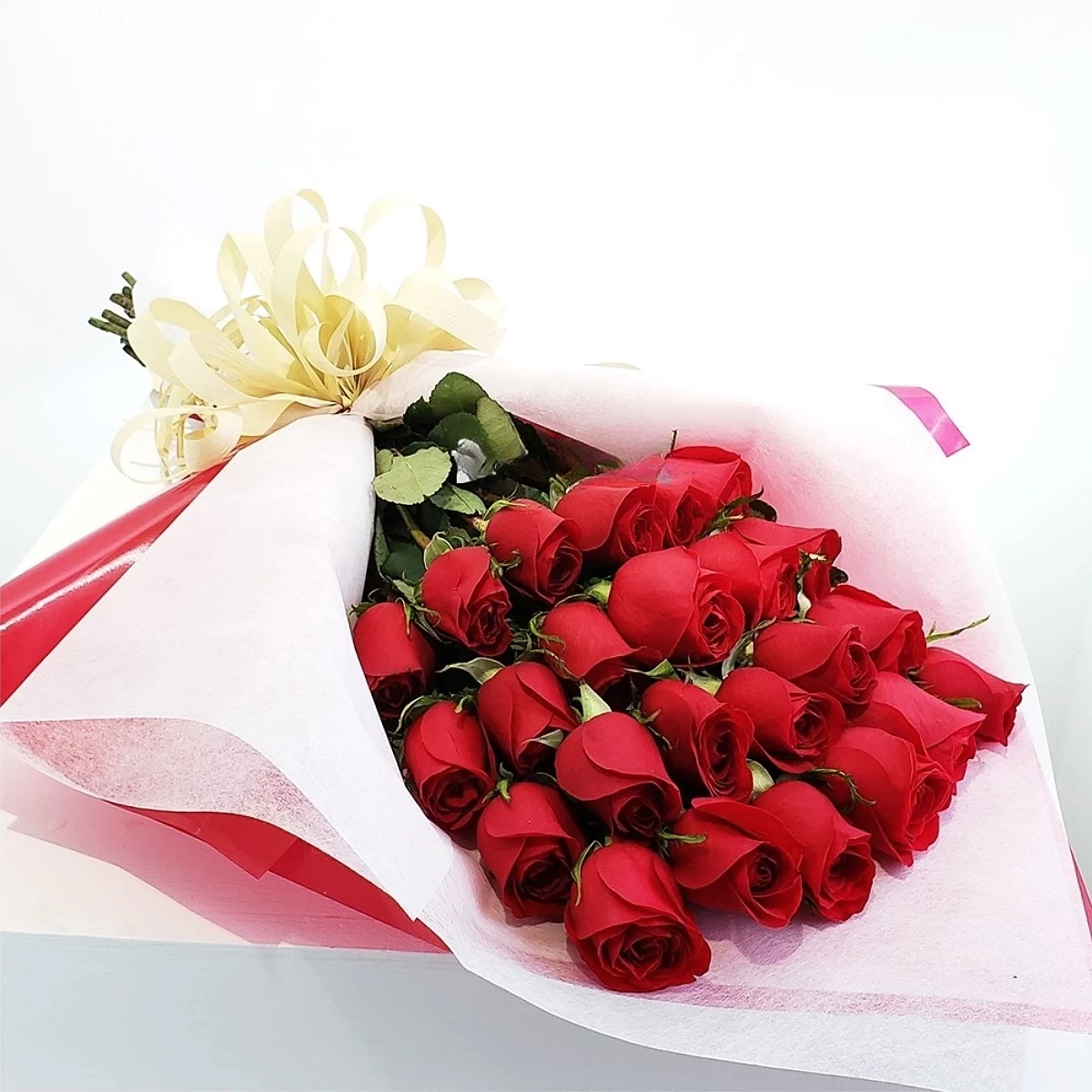 Ramo en cascada con 24 rosas premium, funda bicolor y moño. Un clásico romántico con presencia y elegancia.
