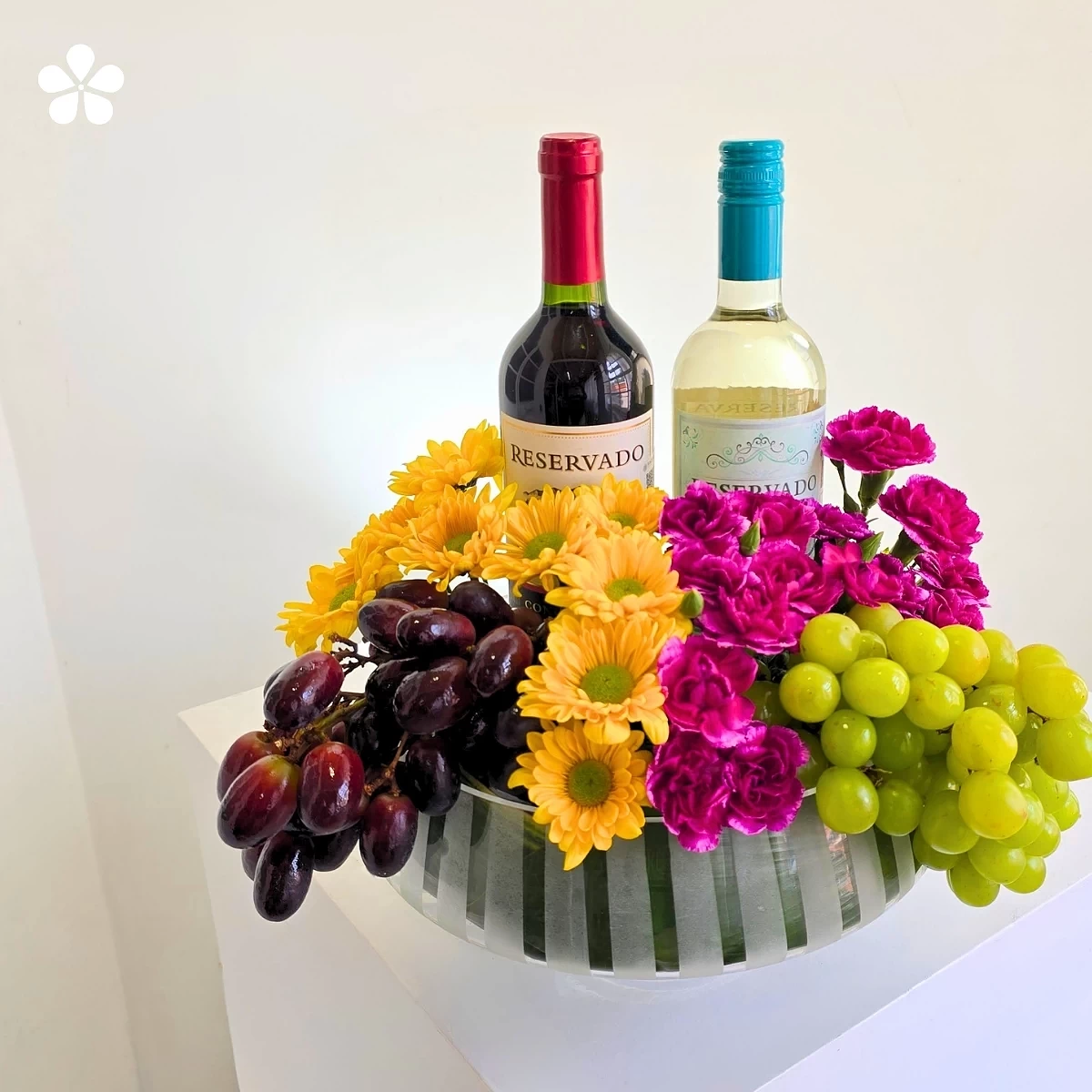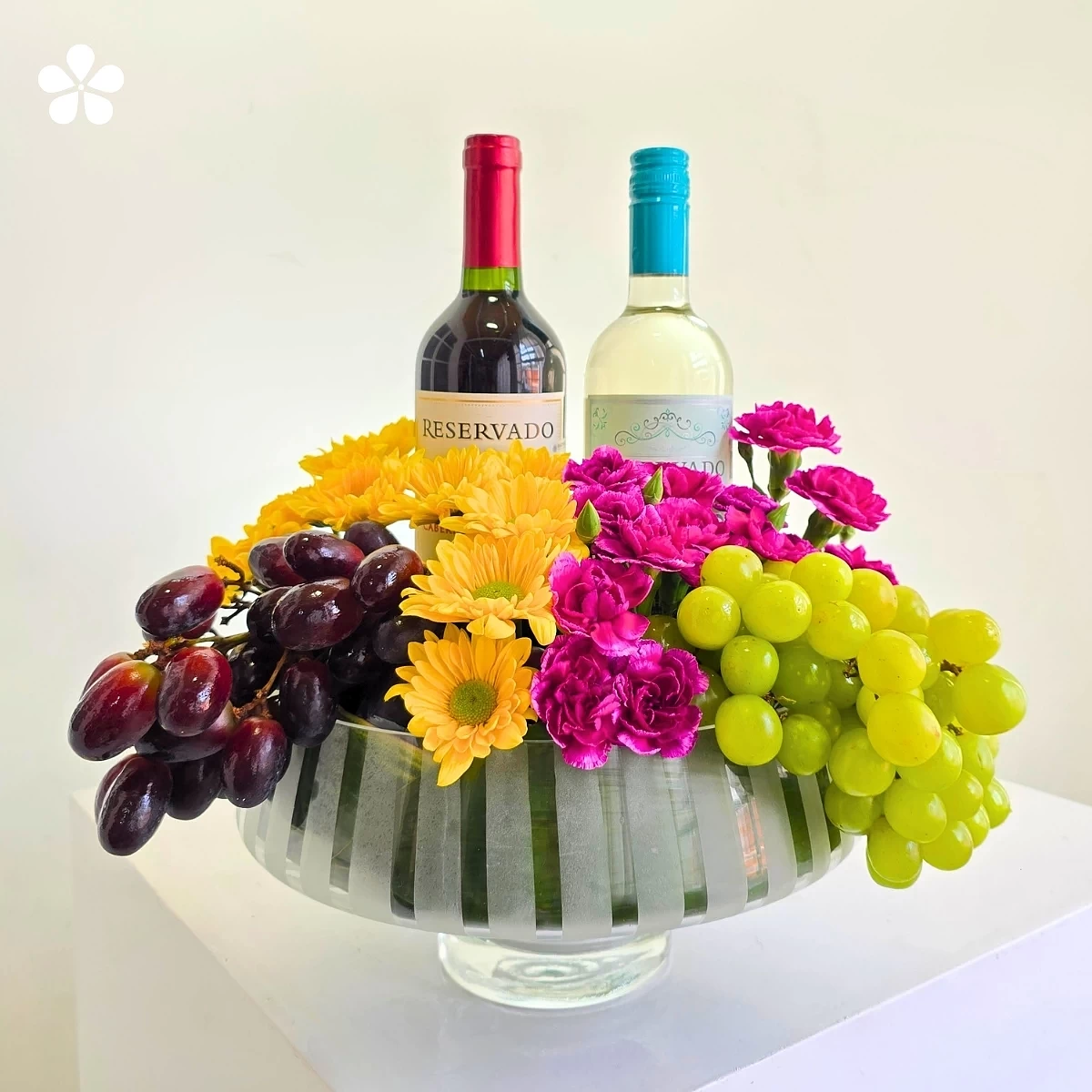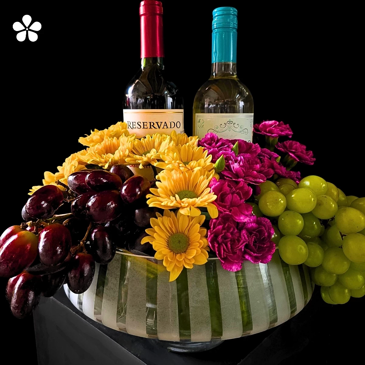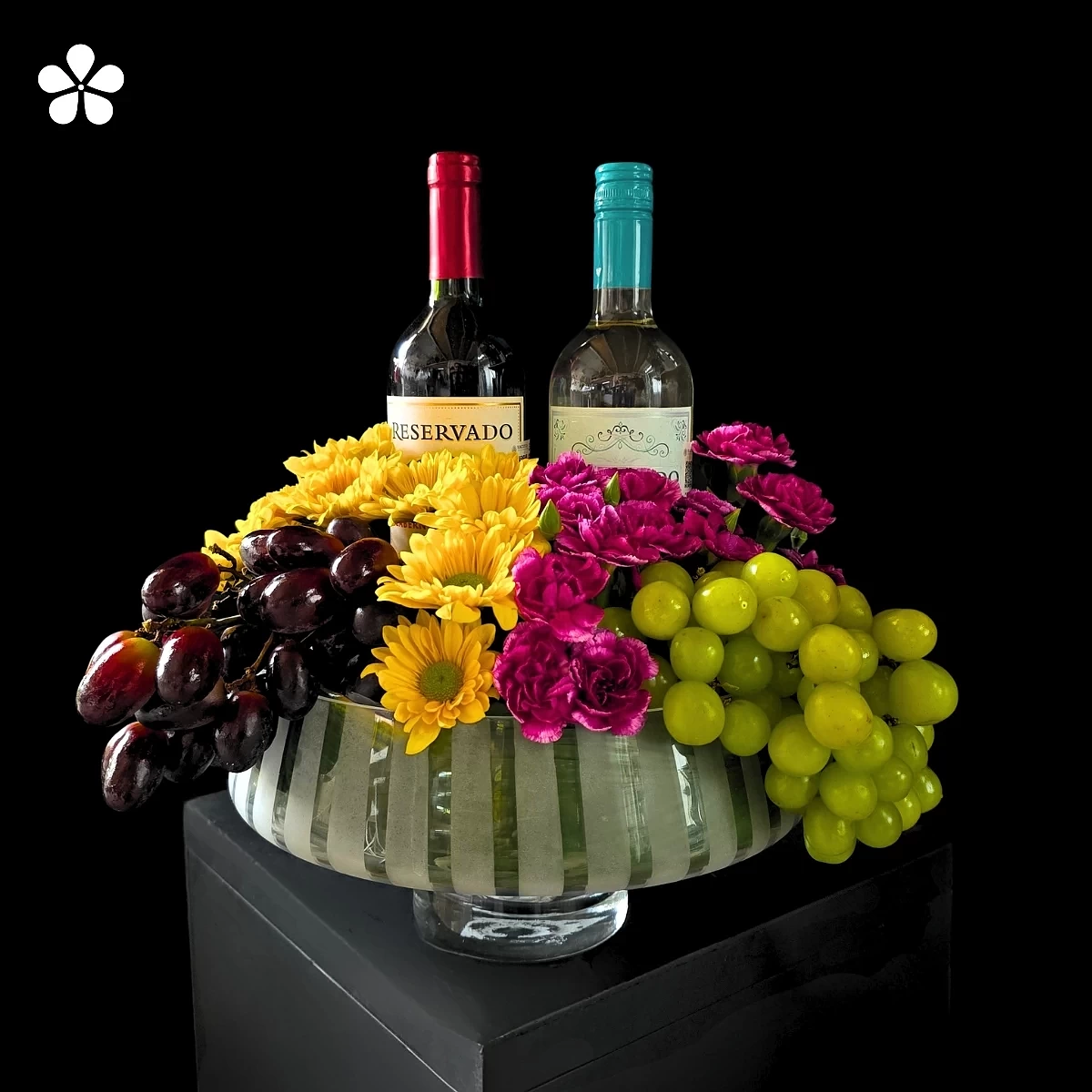 Celebración Selecta. La composición se presenta sobre una base moderna que realza una armoniosa combinación de uvas frescas, elegidas por su calidad y dulzura, acompañadas de un arreglo floral en tonos vibrantes que aporta energía, color y un aire festivo. En el centro, dos botellas de vino elevan la experiencia, convirtiéndolo en el obsequio ideal para aniversarios, celebraciones especiales, agradecimientos o eventos corporativos.