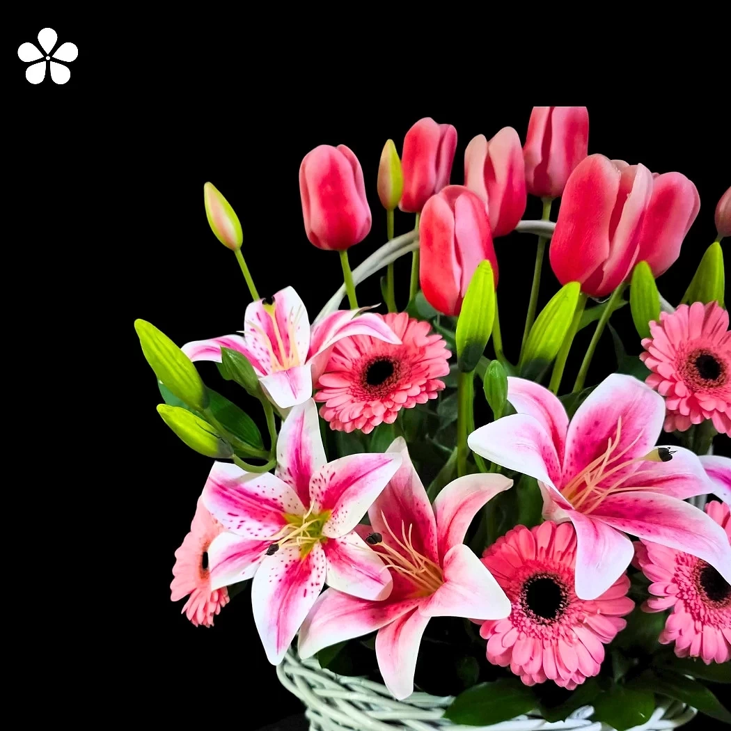 Las lilis rosadas, abiertas en su máximo esplendor, brindan un aire majestuoso y aromático. Las gerberas en tonos suaves añaden frescura y ternura, mientras que los tulipanes rosados aportan verticalidad y un toque moderno. Todo se complementa con una base de follaje verde que realza la intensidad y la belleza natural de cada flor.