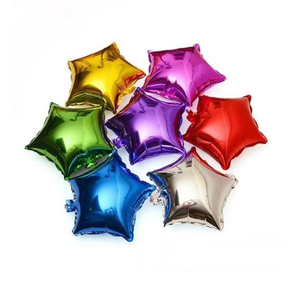 Siete globos metálicos en forma de estrella, en colores vibrantes.