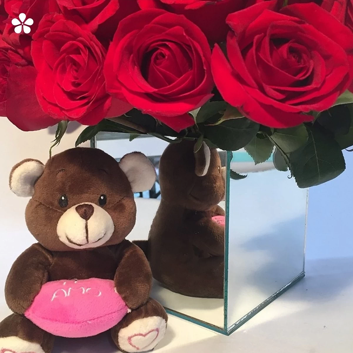 Rosas premium, un oso y un globo de helio en un cubo de espejo que refleja elegancia. El regalo que transforma un momento en recuerdo eterno.