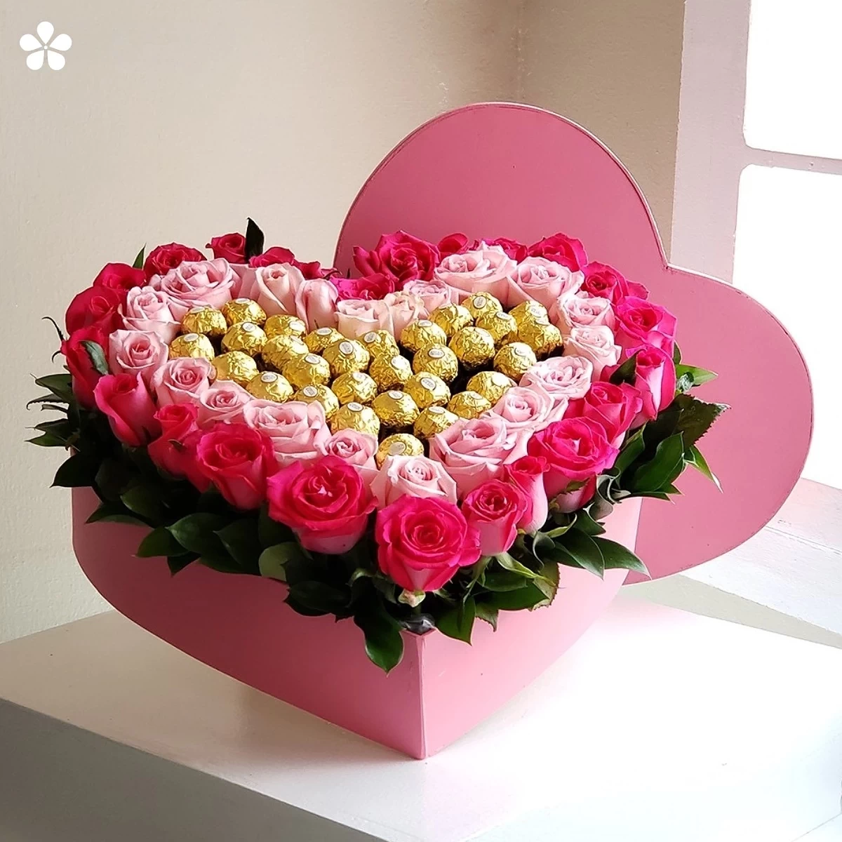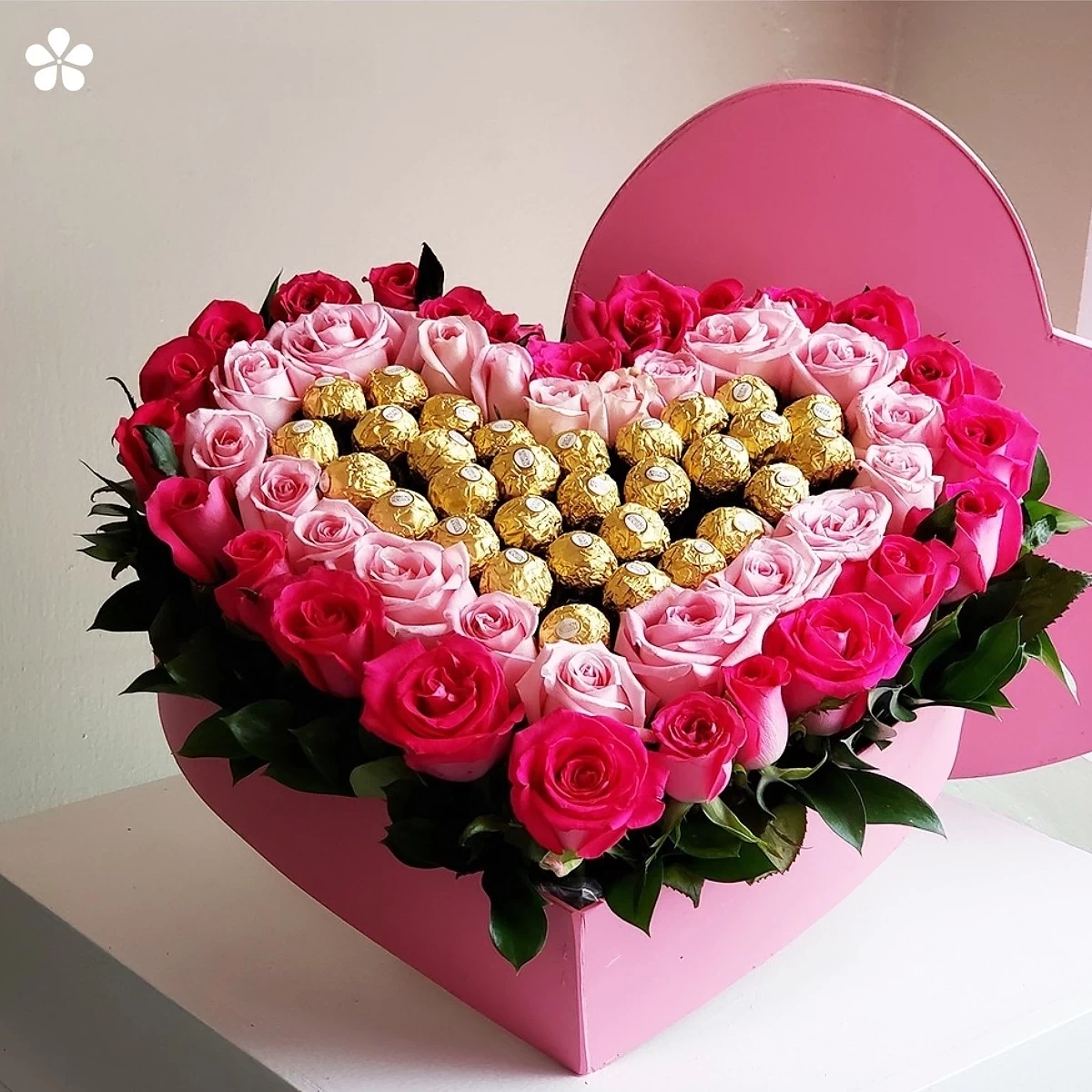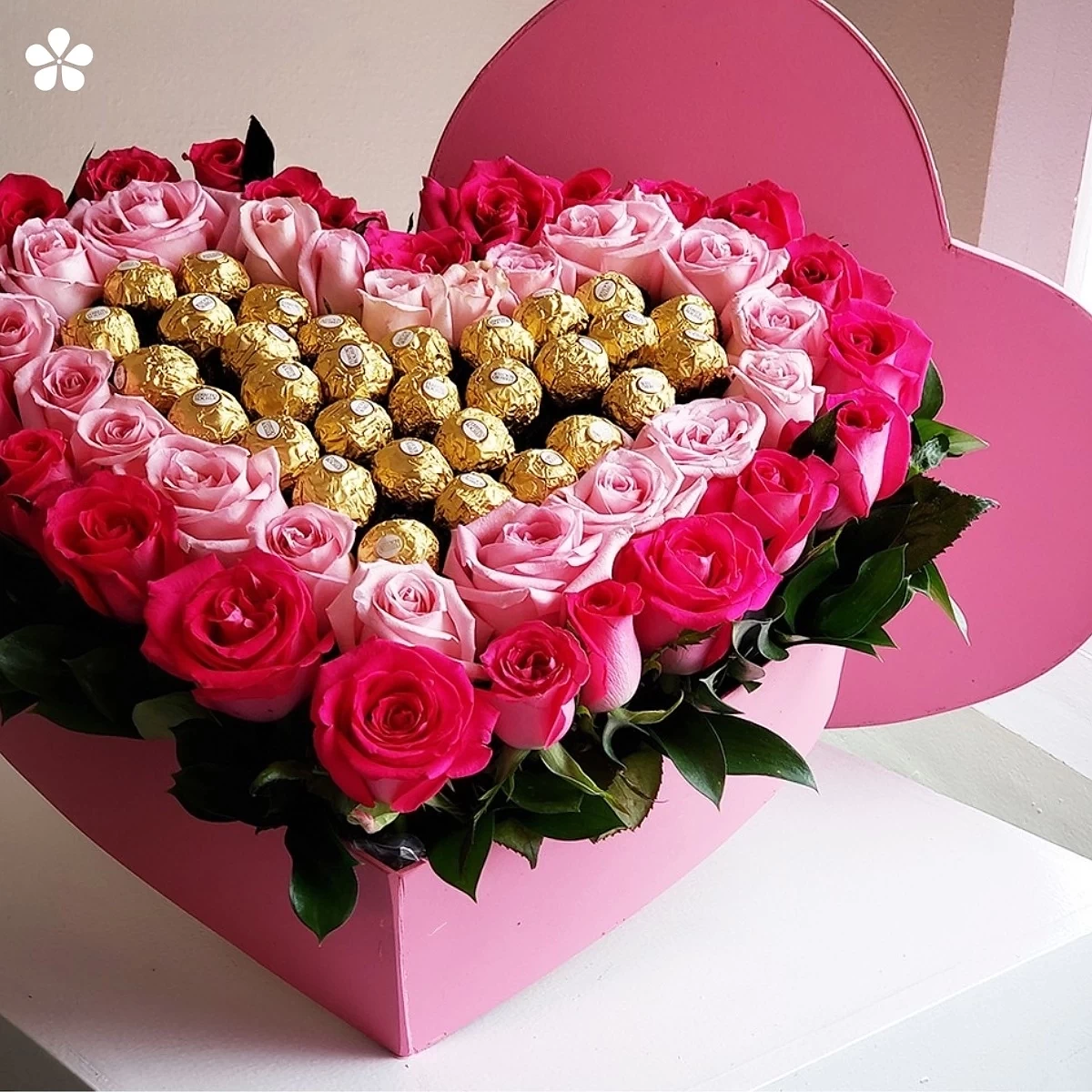 Corazón grande con rosas en dos tonalidades y Ferrero Rocher. Un estuche de madera que hace suspirar desde el primer vistazo.