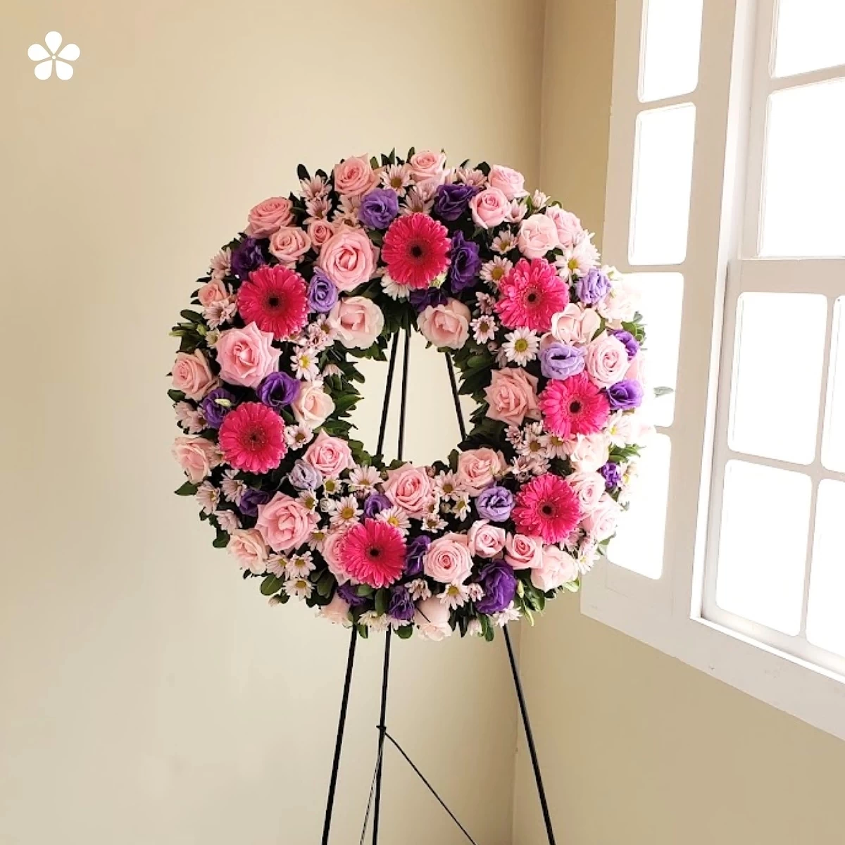 Corona en tonos delicados con rosas, lisiantus, margaritas y gerberas. Un homenaje sereno que reconforta; incluye tripié de bambú.