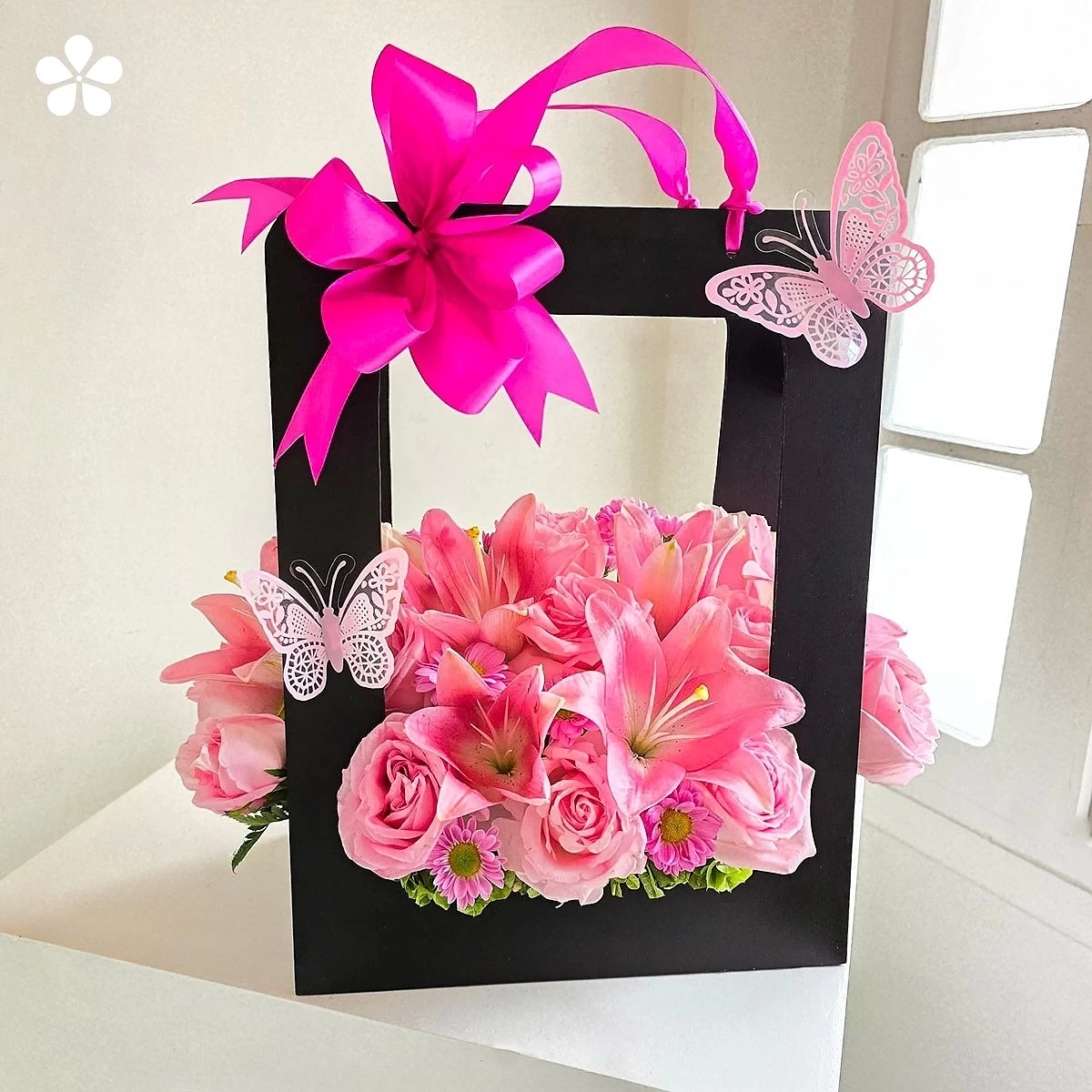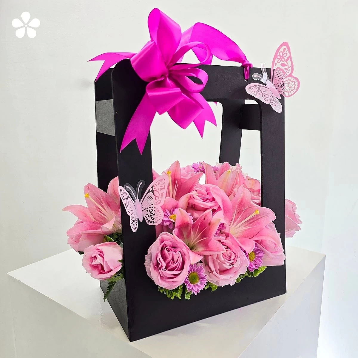 Esta encantadora composición reúne rosas pastel, lilis suaves y margaritas fucsias en una danza armoniosa de colores y texturas. Presentada en elegante caja negra mate adornada con mariposas decorativas y listón fucsia, creando un contraste entre lo romántico y lo moderno que perdura como recuerdo visual.