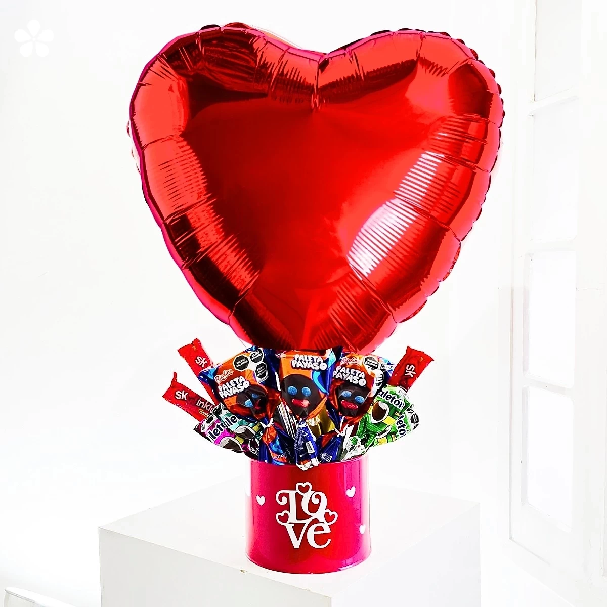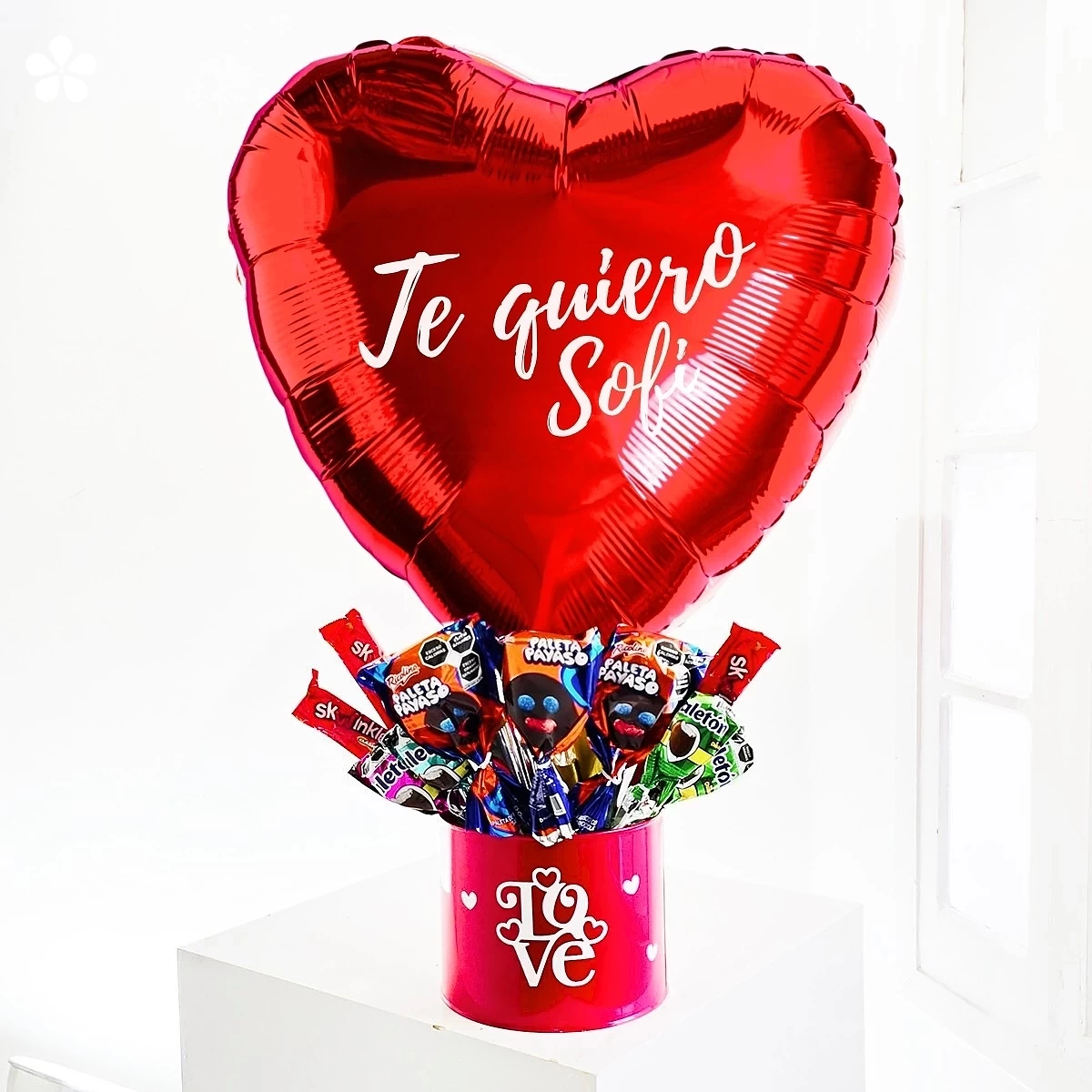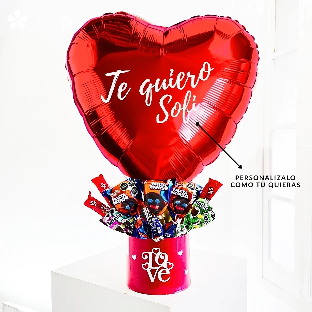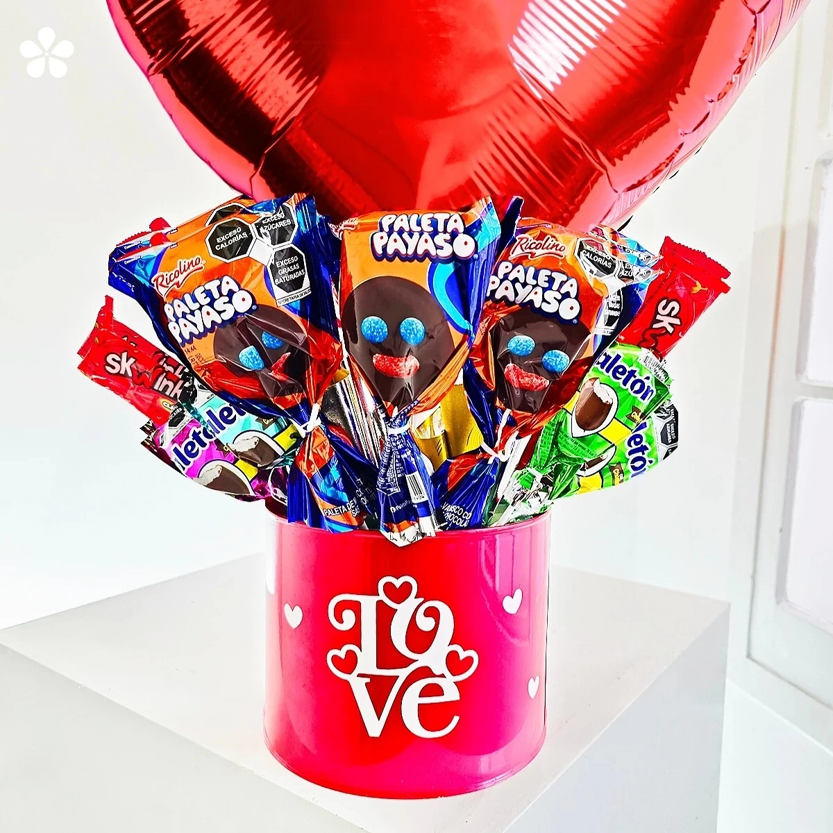Detalle que combina la ternura de un globo metálico gigante en forma de corazón con la alegría de una colorida selección de dulces mexicanos. Diseñado especialmente para robar sonrisas y crear momentos festivos llenos de sabor tradicional.