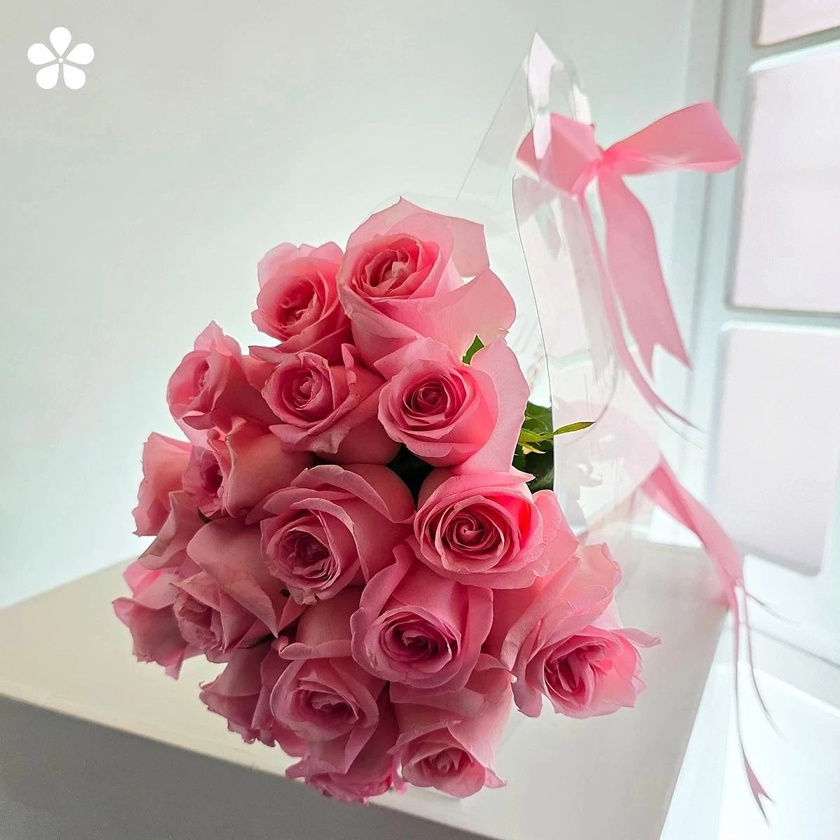25 rosas pastel premium en bolsa transparente personalizable. Pureza moderna con toque personal.