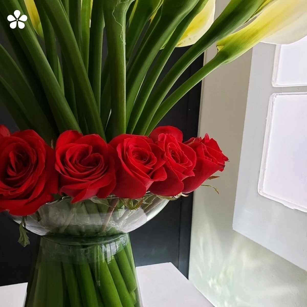 Florero transparente con 35 alcatraces y 16 rosas rojas. Un contraste elegante que transmite emoción.