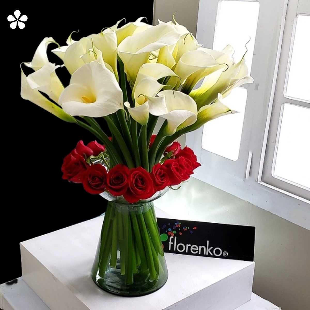 Un diseño vibrante que combina 35 alcatraces blancos con 16 rosas rojas. La mezcla perfecta de serenidad y pasión en un florero transparente.
