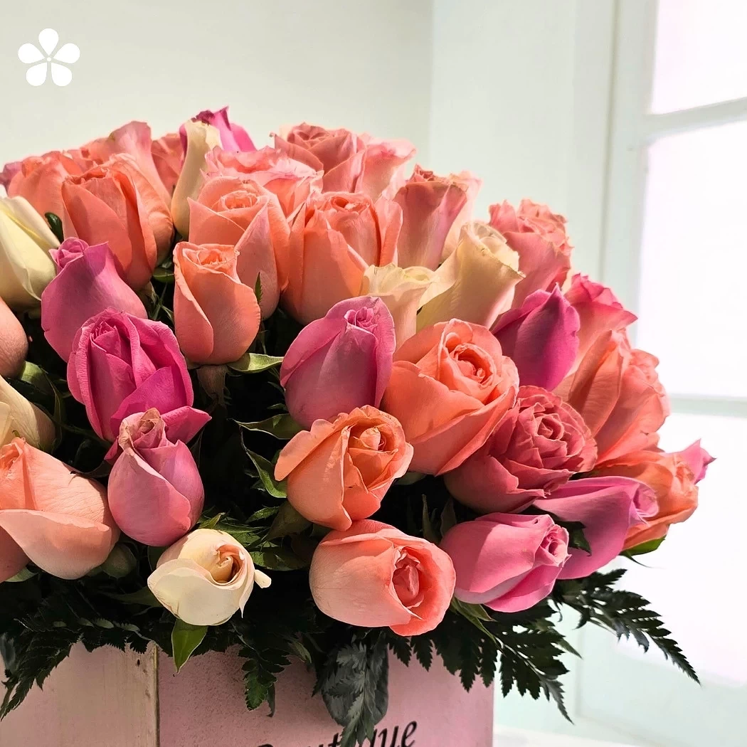 Esfera armónica de rosas premium en sutiles tonalidades dentro de un estuche metálico blanco. Un arreglo tierno y sofisticado para celebrar con estilo.