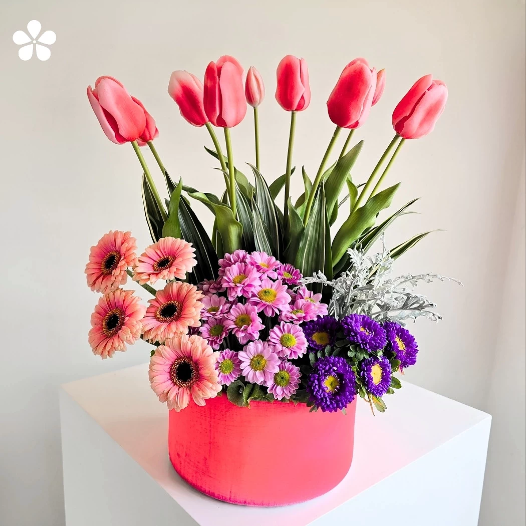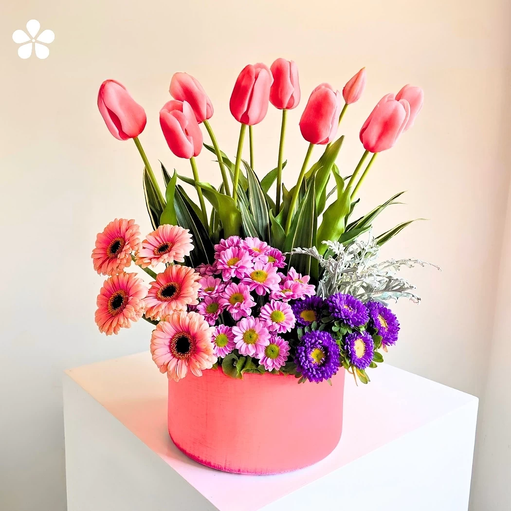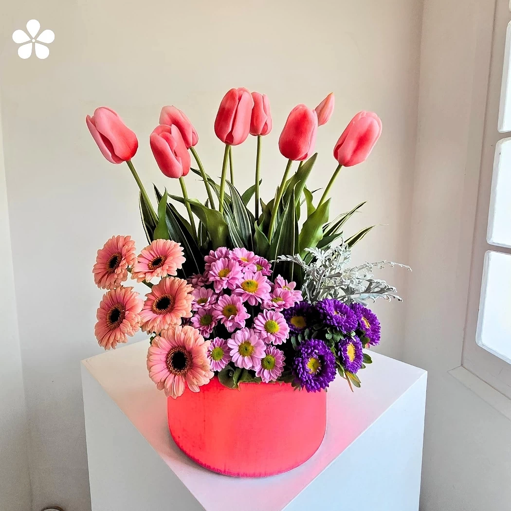 Este arreglo destaca por su base circular en tono rosa, que enmarca armoniosamente una selección de flores frescas y vibrantes.