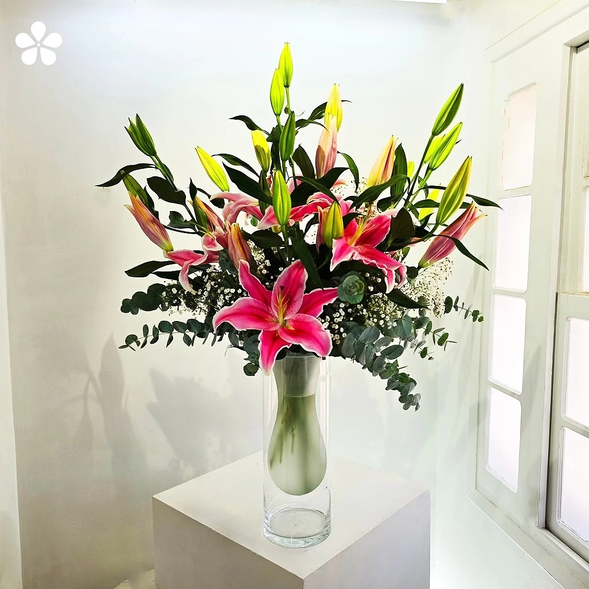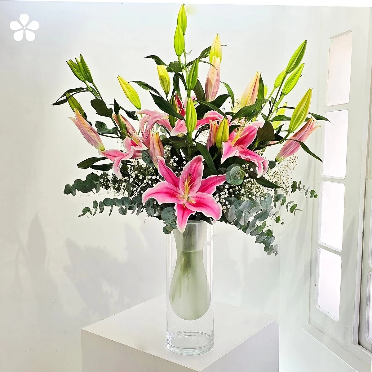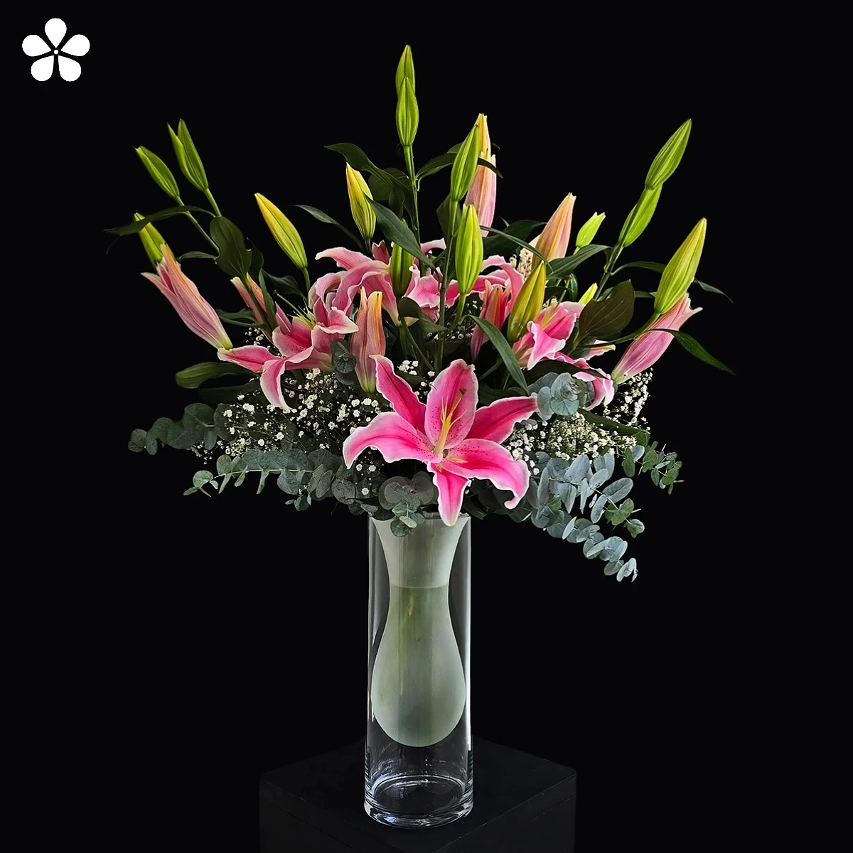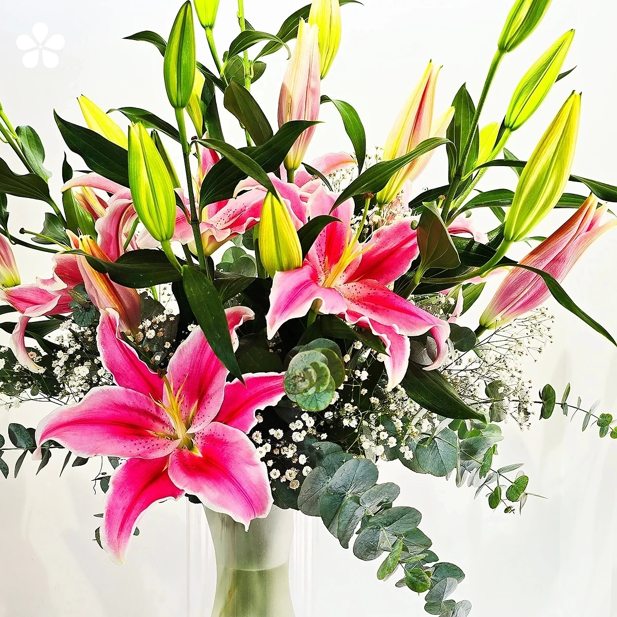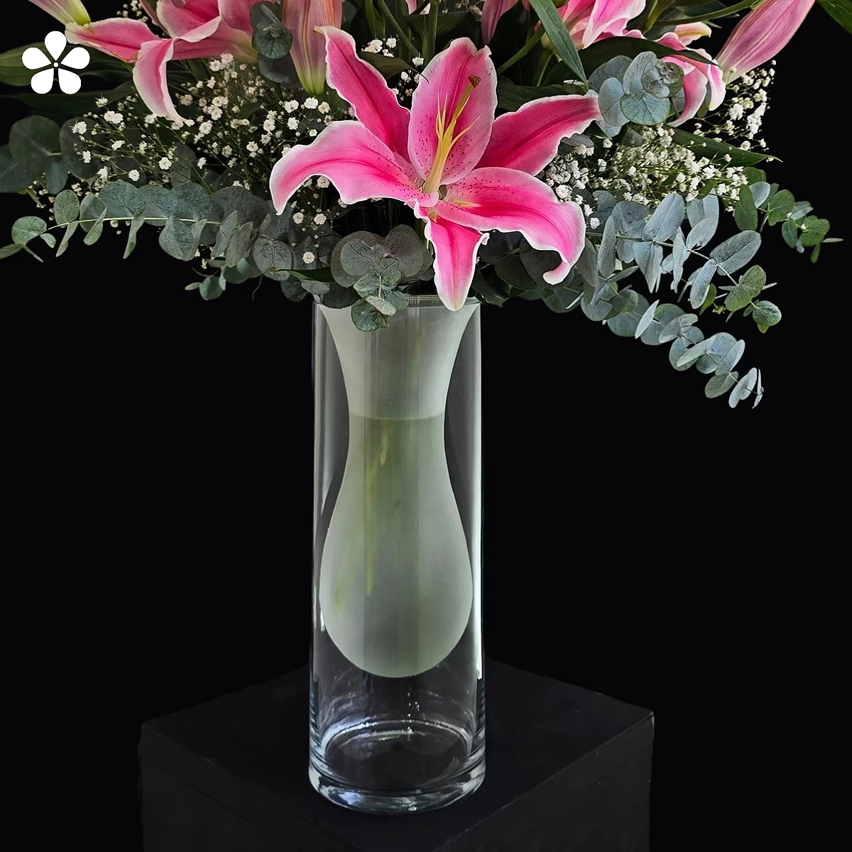 El florero doble esmerilado crea efecto de profundidad única. Cada flor es seleccionada por su tonalidad rosa perfectamente armónica.