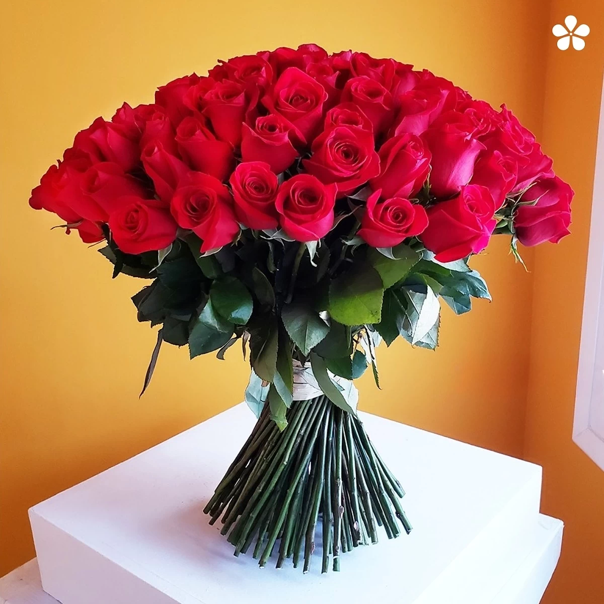 Ramo de 100 rosas premium rojas de tallo largo, con moño y papel decorativo. Un clásico que expresa pasión y elegancia. Altura aproximada: 58 cm.