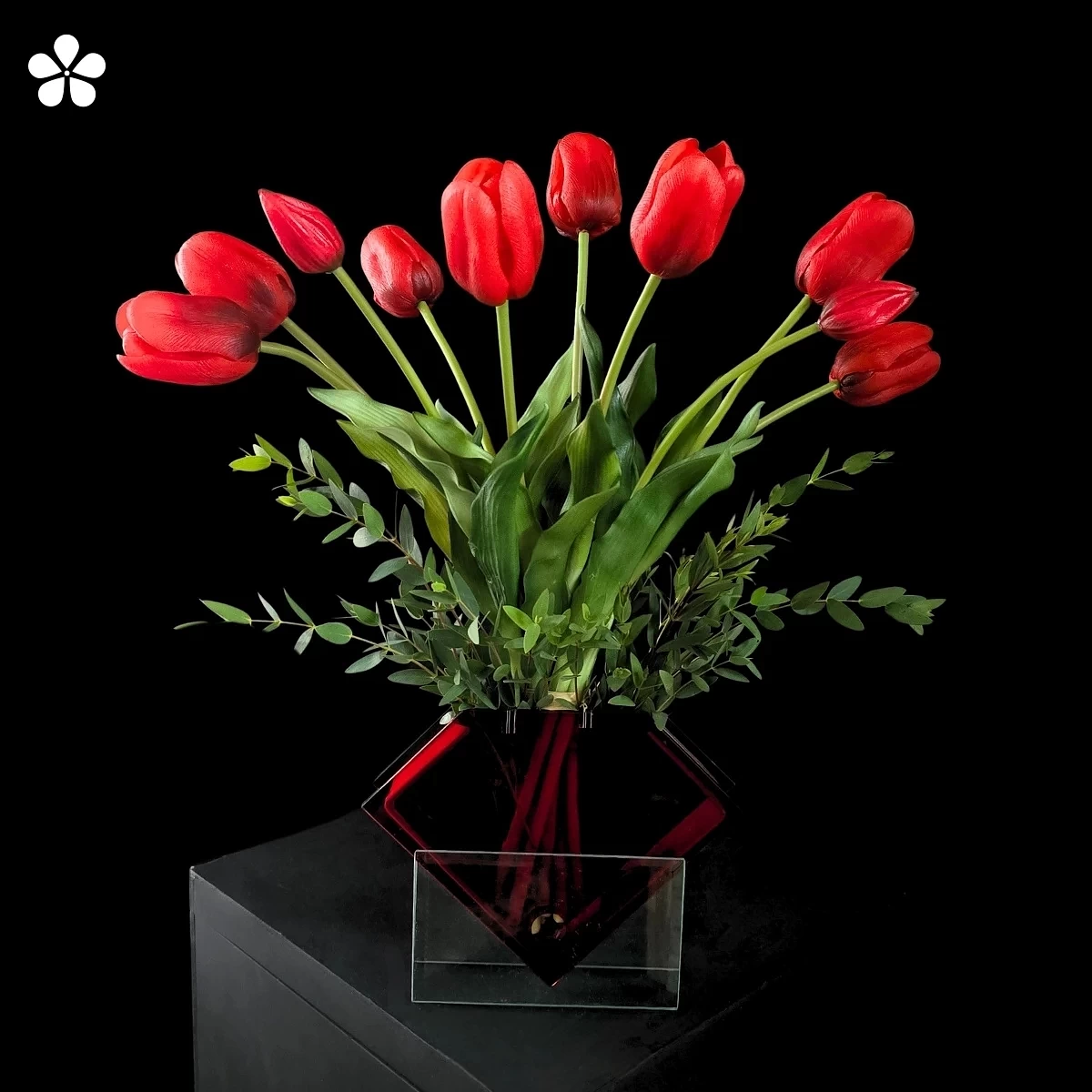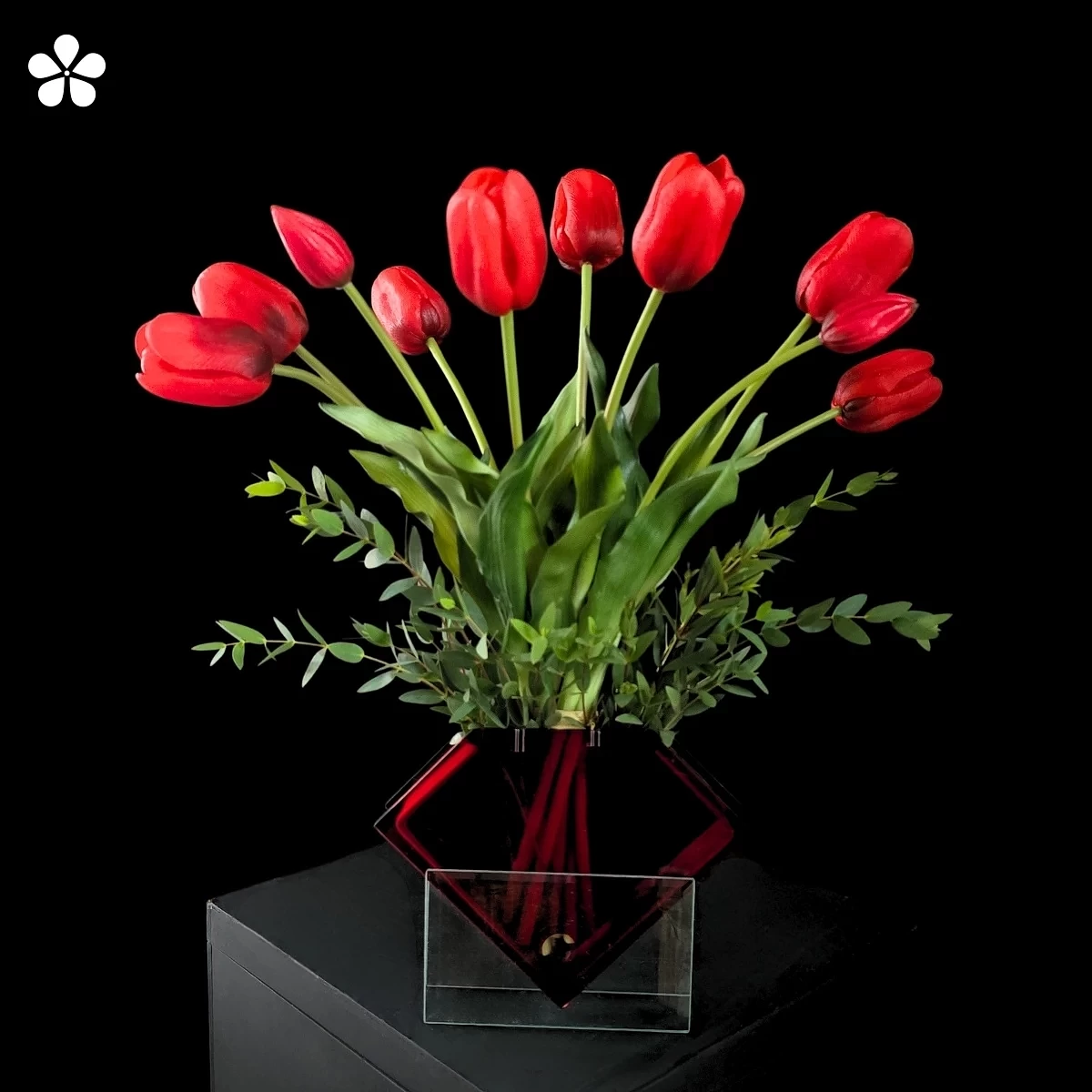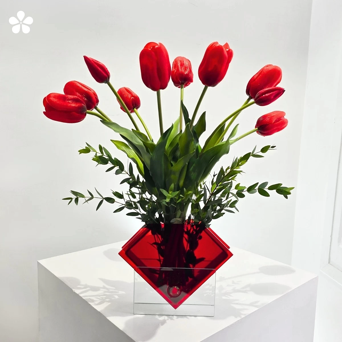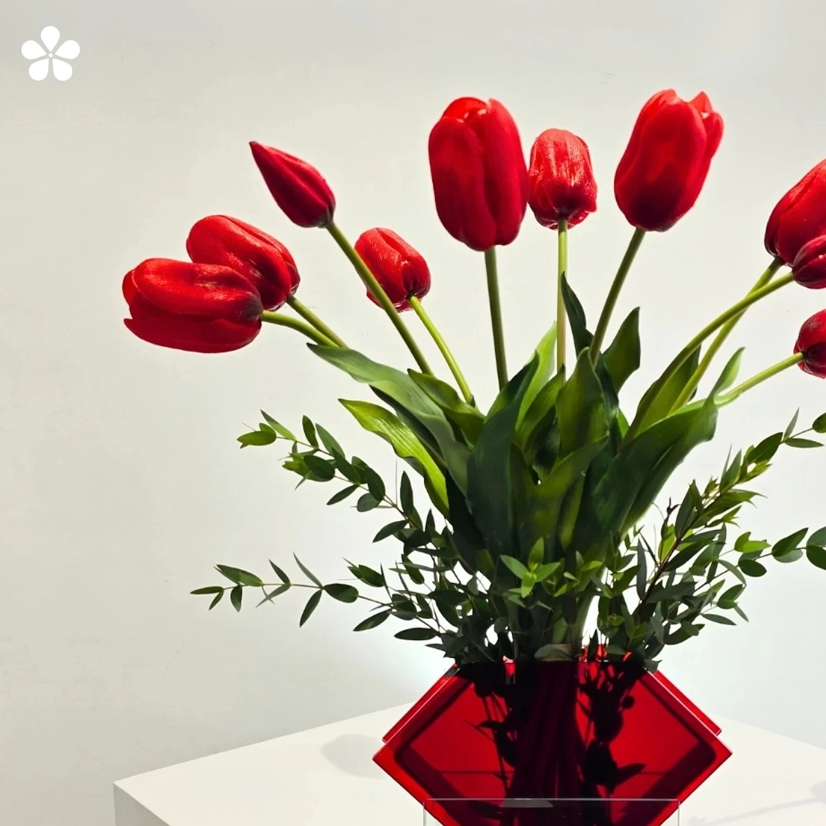 Un florero rojo de doble vista con tulipanes vibrantes. Elegancia pura en edición limitada, ideal para conquistar miradas.