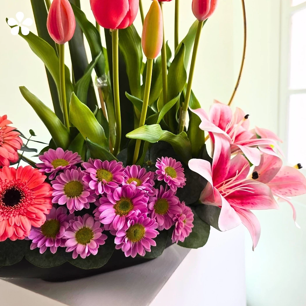 Rodeando esta estructura central, una vibrante mezcla de texturas y tonos añade profundidad: las alegres gerberas rosadas aportan un toque de optimismo y energía, mientras que las margaritas crean una base texturizada.