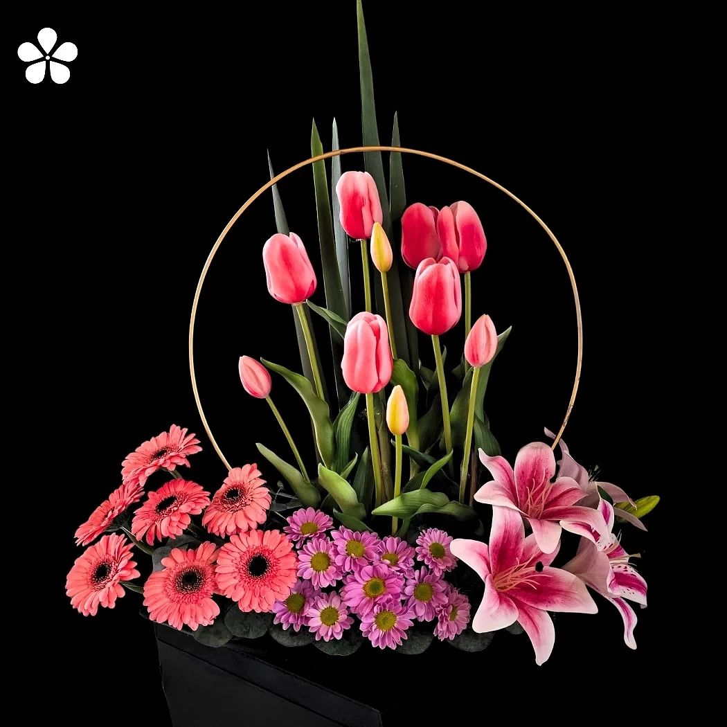 Este arreglo está centrado por un elegante aro metálico dorado que enmarca la majestuosa verticalidad de los tulipanes rosados .