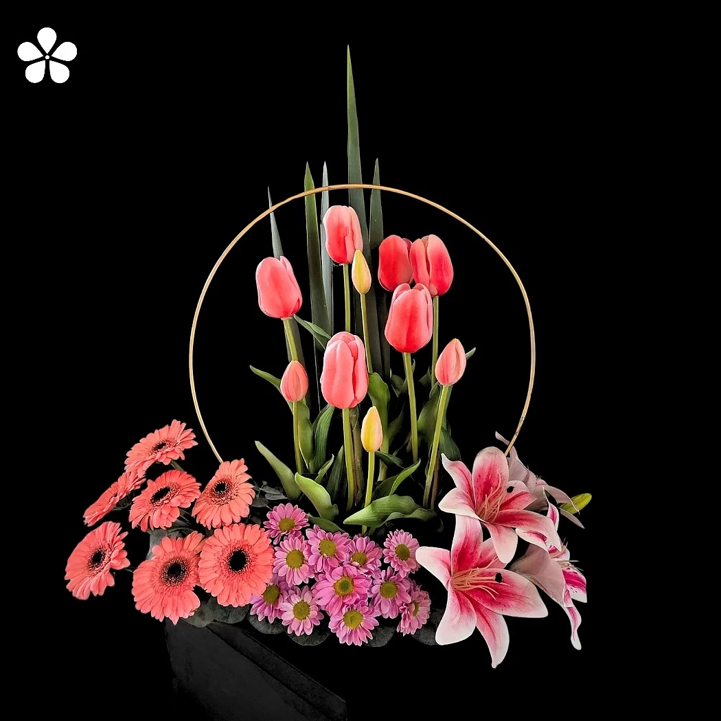 Es una obra maestra de diseño floral moderno, donde la geometría y la vitalidad de la naturaleza se unen.