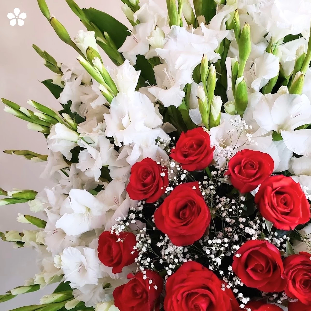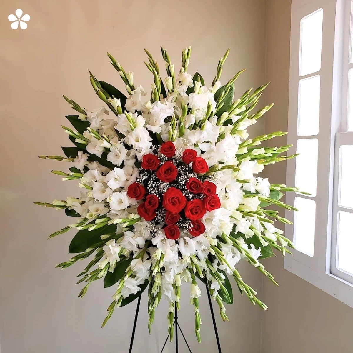 Un medallón floral con gladiolas blancas y centro de rosas rojas. Un homenaje sobrio y elegante para expresar condolencias profundas.