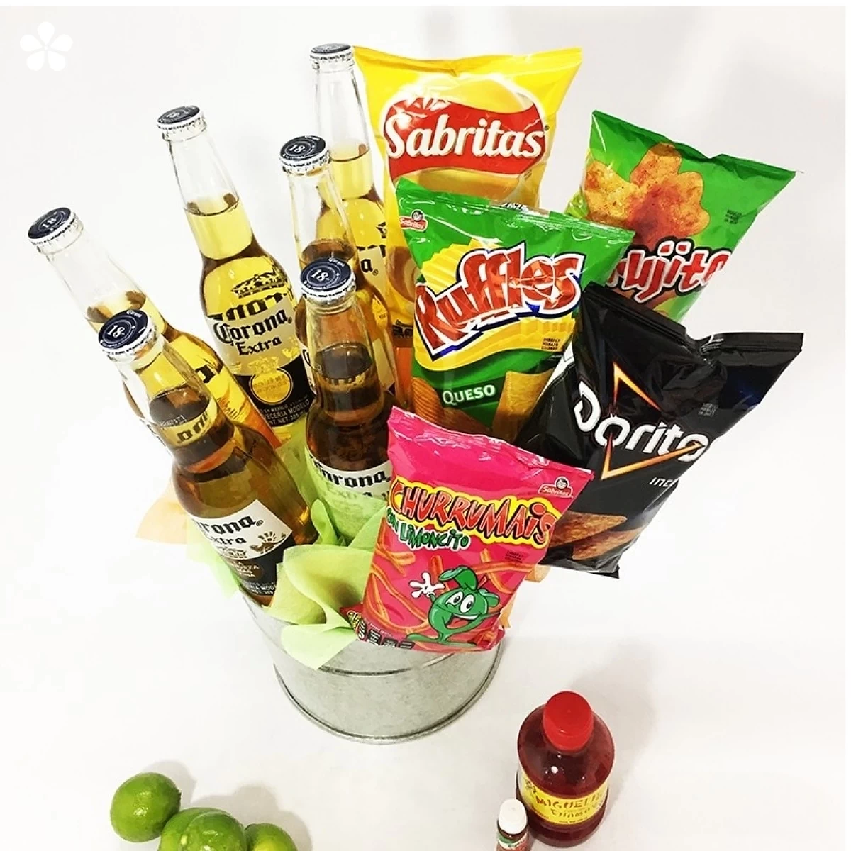 Una cubeta lista para la celebración: cervezas bien frías, botanas para compartir y el toque picante de chamoy, salsa y tajín. Un detalle sencillo, alegre y directo al corazón del festejo.