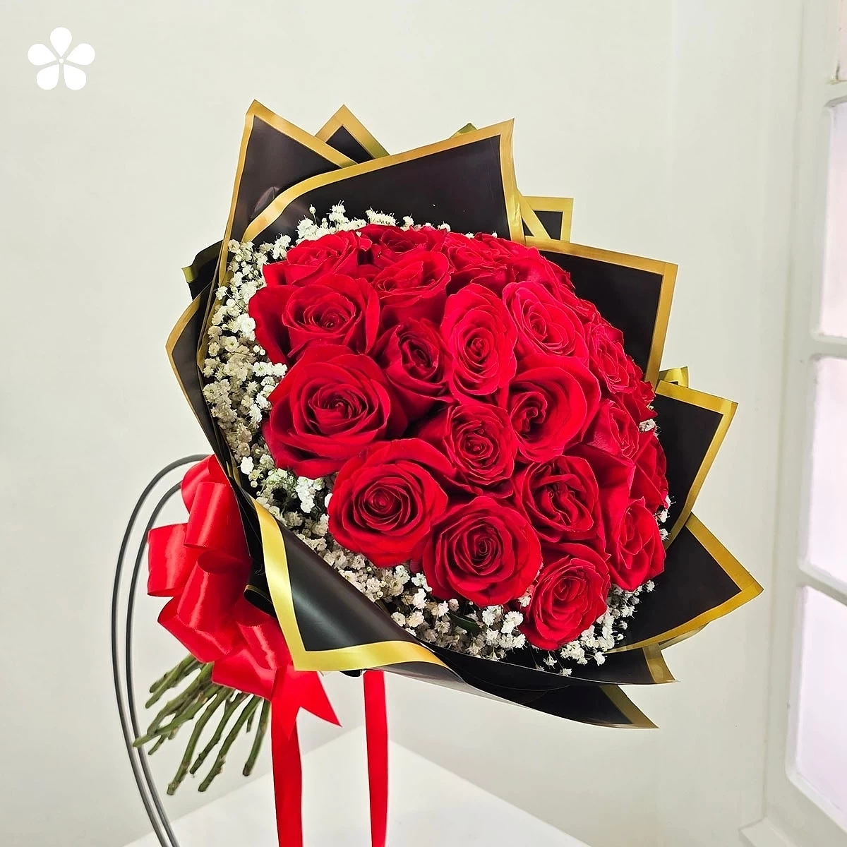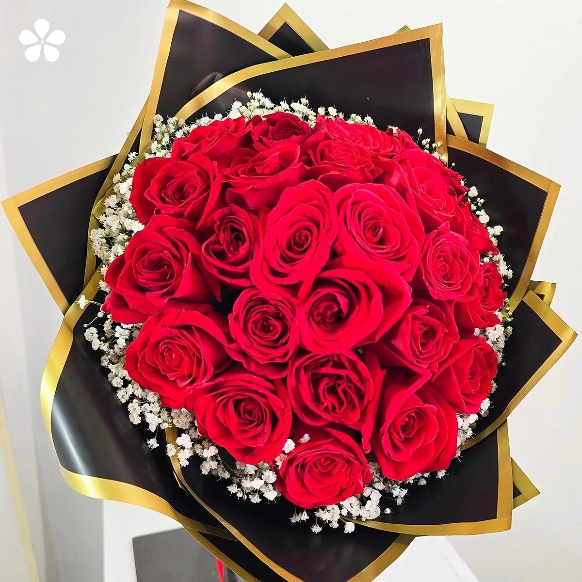 Bouquet de 25 rosas rojas de tono profundo (símbolo de pasión sincera) acentuadas con pequeñas flores blancas que aportan equilibrio romántico. Presentado en papel negro con detalles dorados para evocar sofisticación y distinción.