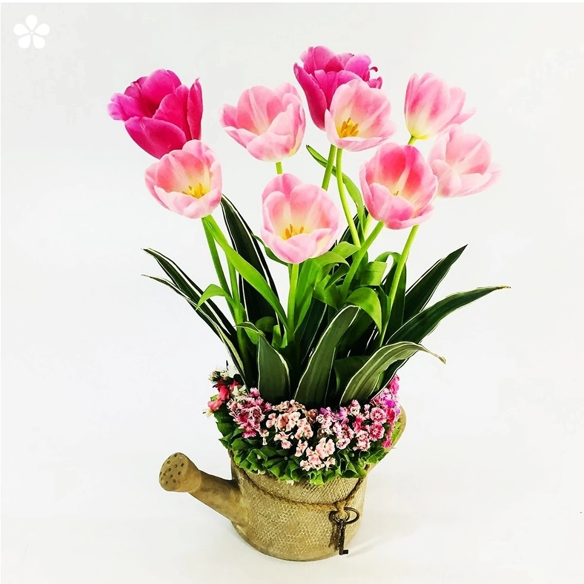 Soñadora regadera decorada con tulipanes, florecitas y follajes.