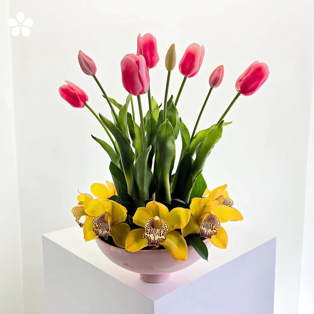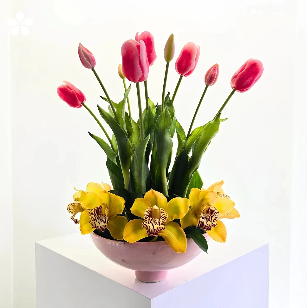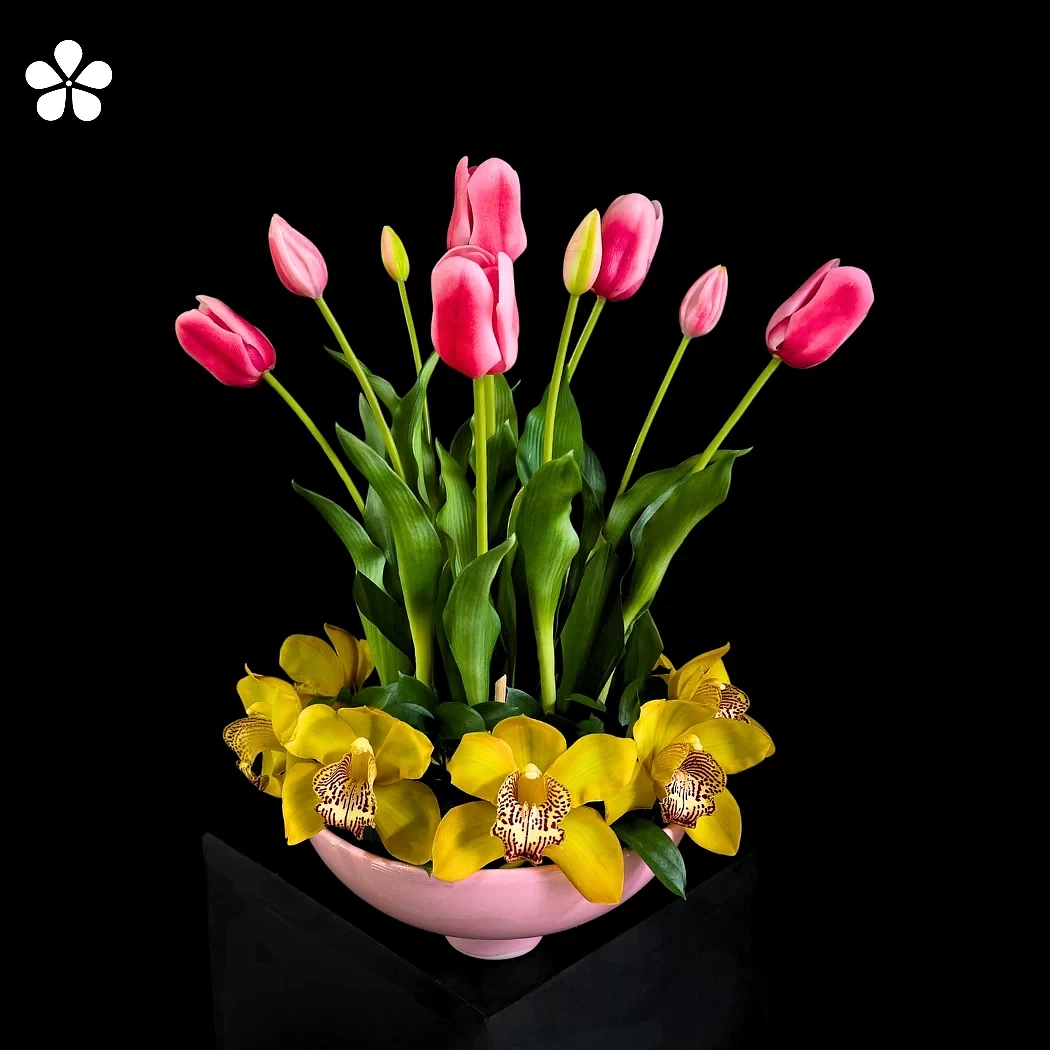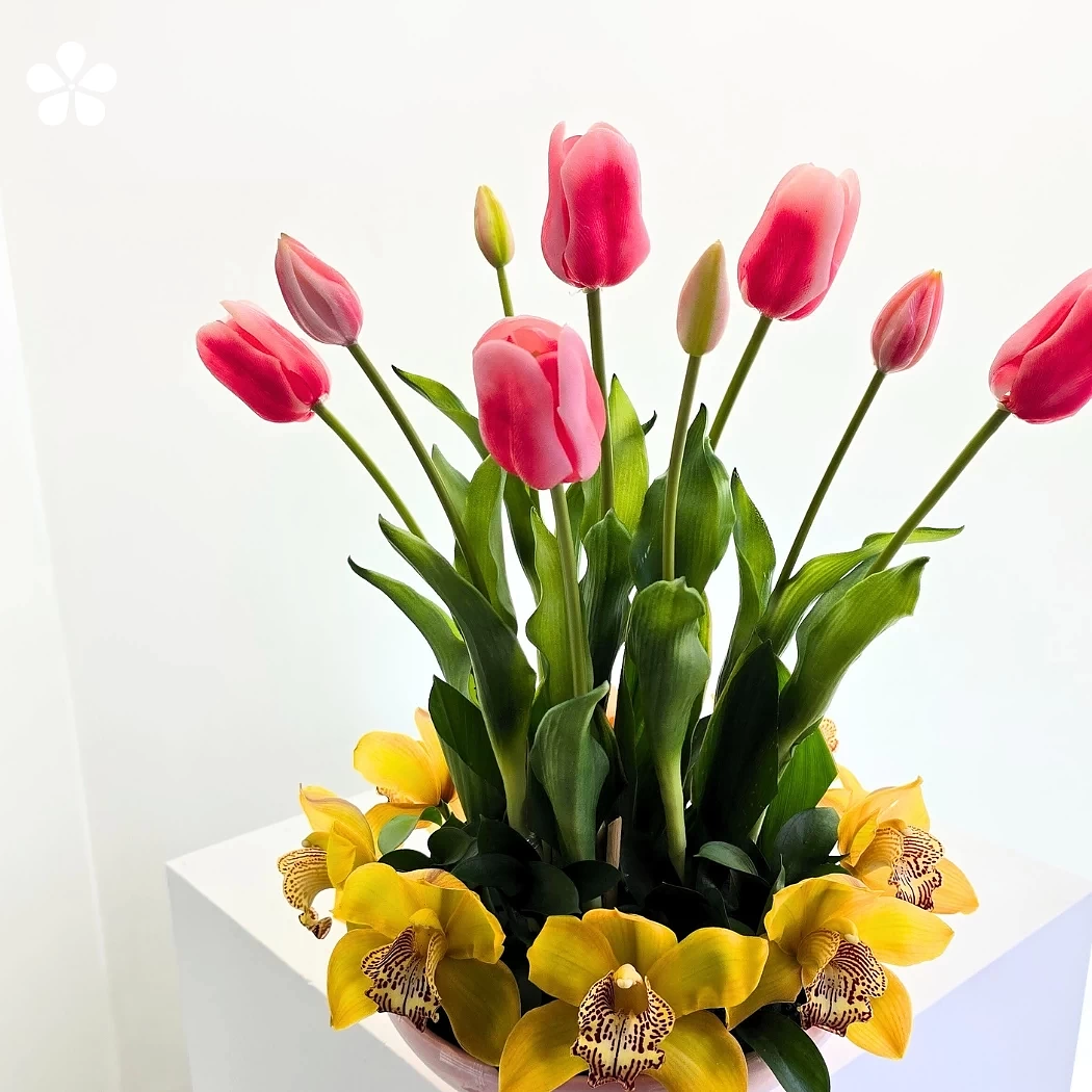 Es un delicado arreglo floral que une la suavidad de los tulipanes rosas con la elegancia luminosa de las orquídeas amarillas, creando un contraste fresco, armonioso y lleno de vida.