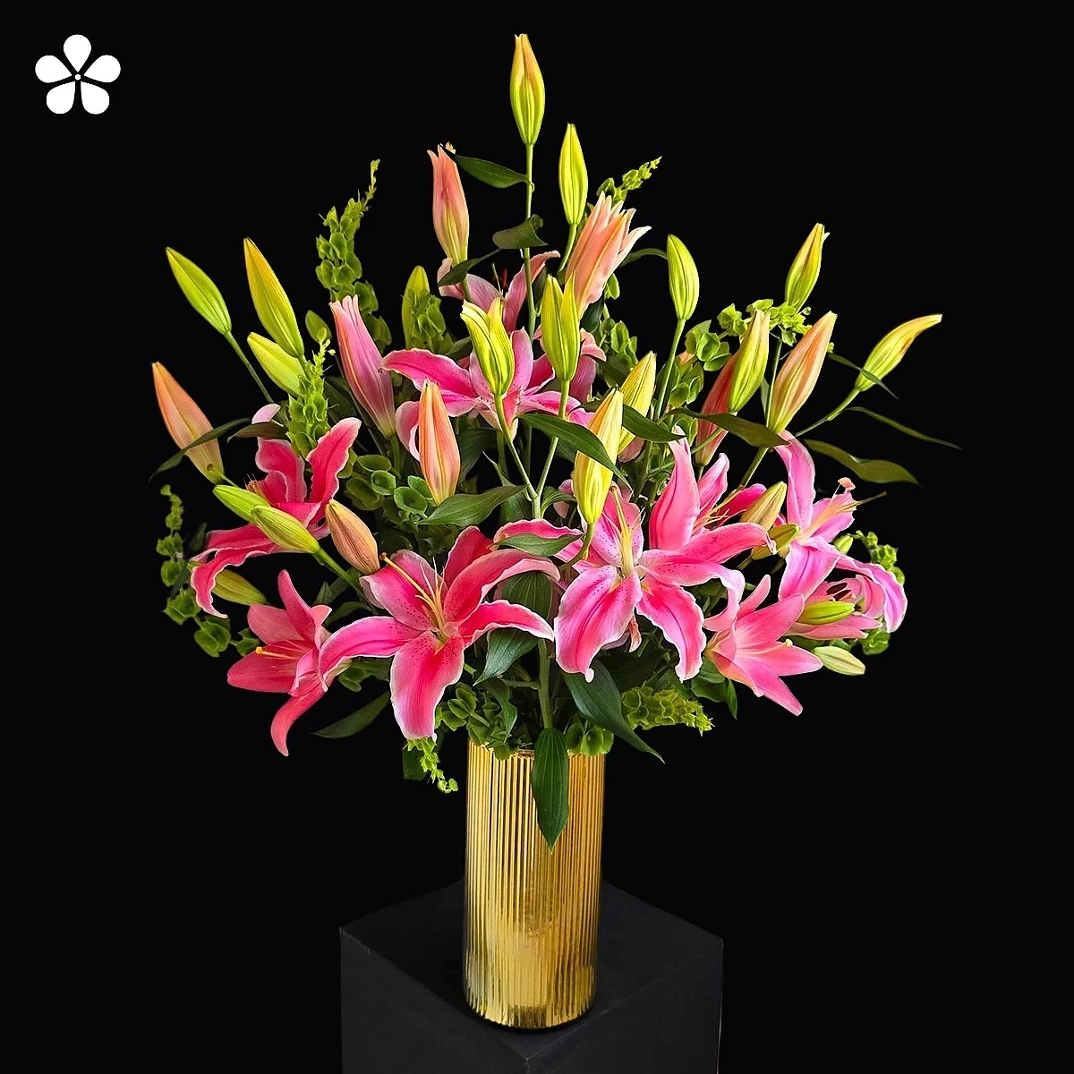 Este radiante arreglo presenta acapulcos en distintos tonos de rosa dispuestos con elegancia en florero dorado que resalta su carácter sofisticado. Las flores abiertas transmiten vitalidad mientras los brotes sugieren renovación y posibilidad infinita.