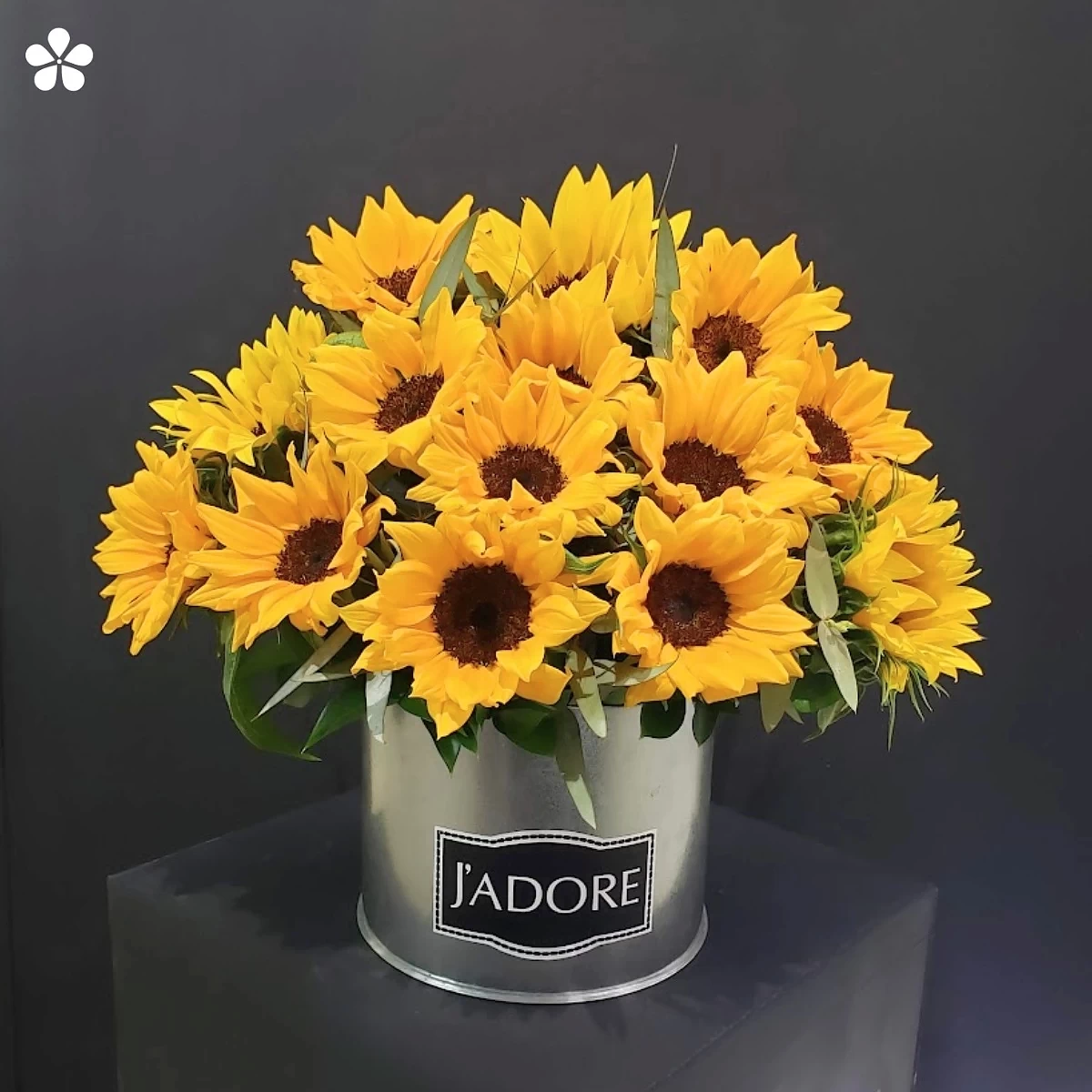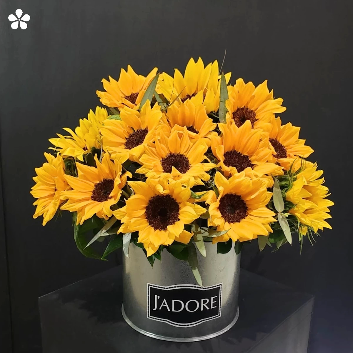 Treinta girasoles Fullson en moderno estuche metálico con toques de eucalipto. Sencillo, carismático y cargado de buenas vibras.