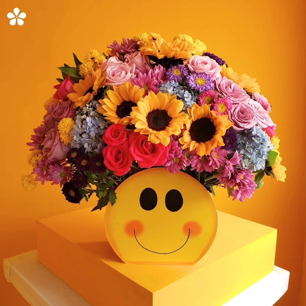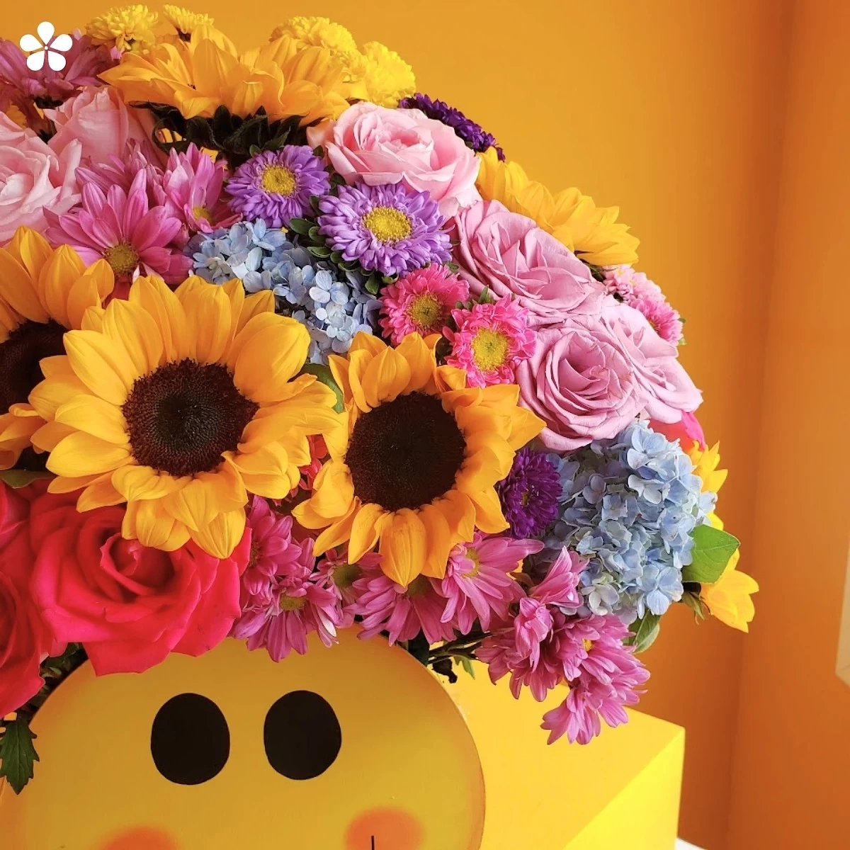 Arreglo de doble vista que combina girasoles, rosas, margaritas, hortensias azules y yokos en una alegre base SMILLE. Colores vibrantes para encender cualquier espacio.