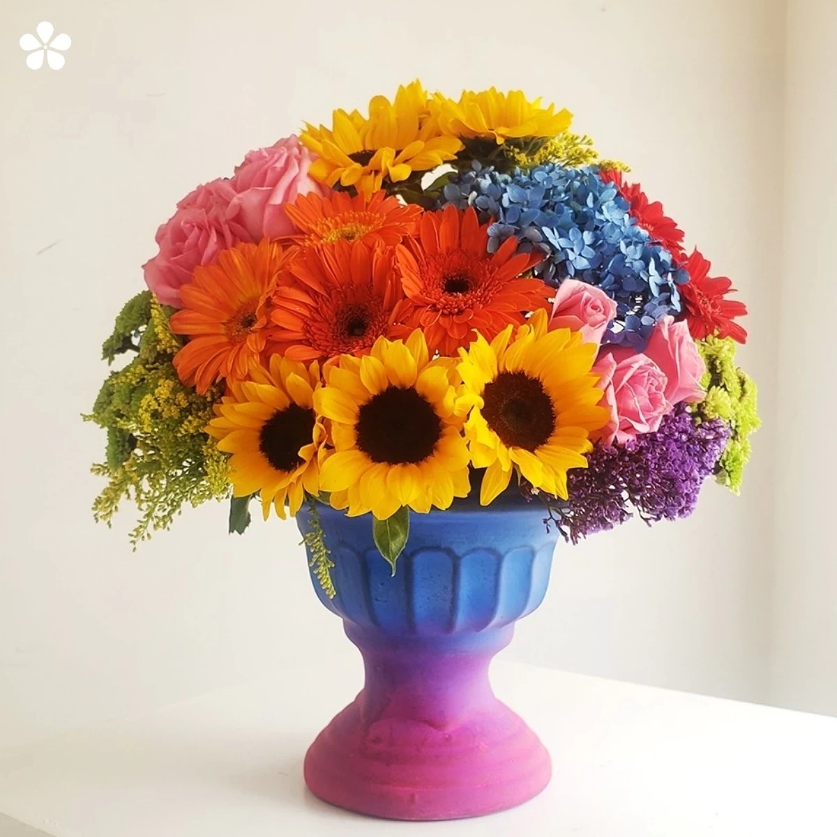 Girasoles, rosas pastel, gerberas naranjas, hortensias y yokos en copa cerámica de dos tonos. Un arreglo vibrante que transforma cualquier rincón con alegría.
