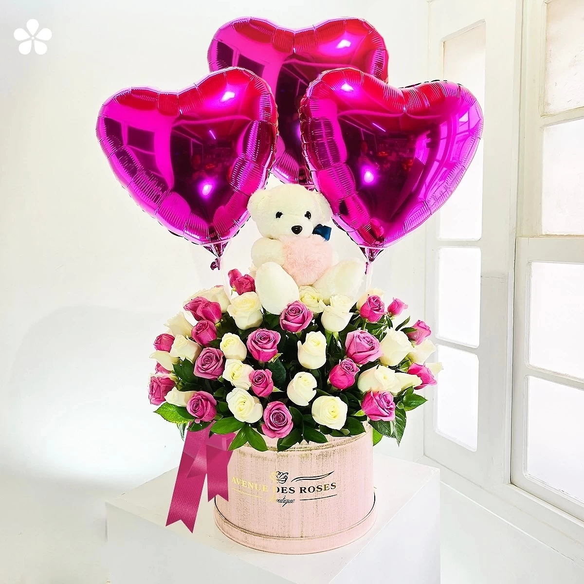 Este encantador arreglo combina la elegancia de 50 rosas en tonos blanco y fucsia con la dulzura de globos corazones personalizables y un tierno osito de peluche. La base cilíndrica vintage rosa con listón complementario crea el regalo perfecto para expresar tus sentimientos más profundos.