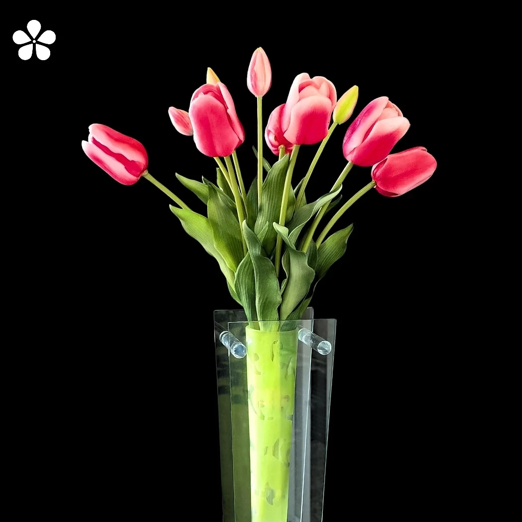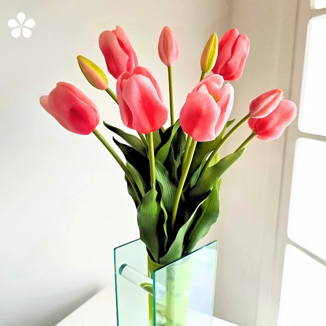 Dale vida y estilo con un arreglo moderno que combina la suavidad de los tulipanes rosados con la transparencia sofisticada de un florero rectangular de vidrio.